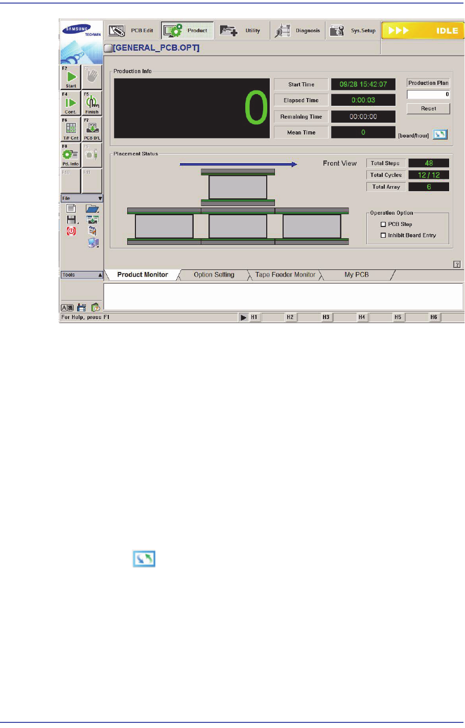 11-4 Samsung Component Place r SM471 Administrator's Guide <board/hour> 최초 PCB 가 Work Sta tion 으로 투입된 이후 , 한 시간 동안 생산된 PCB 의 수를 나타냅니다 . <Production Plan> 에디트박스 전체 작업 할 PCB 매수를 설정합니다 . 값이 0 이 되면 생산을 멈…
