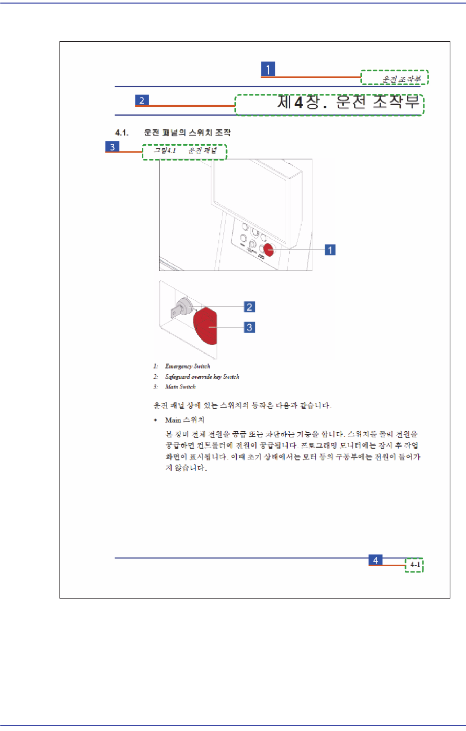 Samsung Component Place r SM471 Administrator's Guide xvi Page Layout 1: 장 제목 / 매뉴얼 이름 2: 장 제목 3: 그림 ( 장번호 )-( 그림순서 ).( 그림제목 ) 4 장의 첫 번째 그림이며 , 그림의 제목이 운전패널 임을 나 타냅니다 . 4: 장 번호 - 페이지 (4 장의 첫 페이지를 의미합니다 )