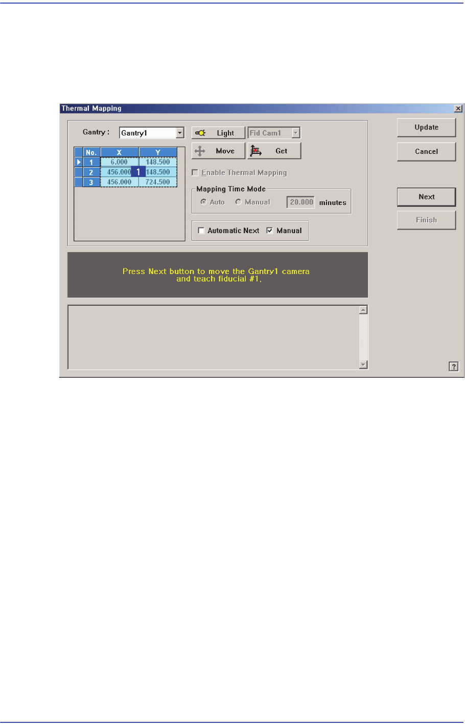 12-36 Samsung Component Place r SM471 Administrator's Guide 12.3.7. Gantry Thermal Mapping 장비의 가동 후 , 볼 스큐류의 마찰 열로 인해 발생되는 XY 좌표계의 열변형을 보상 하기 위해서 Conveyor 상의 Fiducial Mark 3 점을 티칭해 주어야 합니다 . 그림 12.13 “ Gantry Therma…