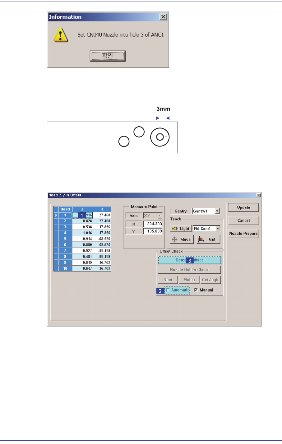 12-49 Machine Calibration Z Of fset 을 측정하는 위치는 전면 ANC 의 Calibration Tool 위치 ( 중심 ) 에서 3mm 벗어난 곳이므로 이 곳에 이 물질이나 Calibration Tool 이 있으면 미리 제거하십 시오 . 2. <Grid> 영역 에서 캘리브레이션을 실행할 Head 의 Z 축을 선택하고 , <Automatic> 체크…
