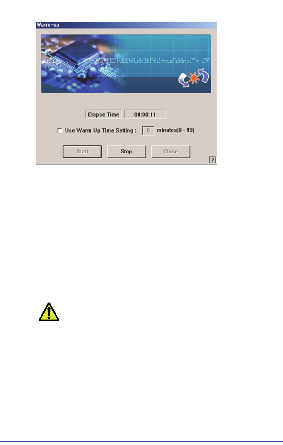 “Warm-up” 대화상자에 경과 시간 (Elapsed Time)을 표시합니다. 다시 클릭하