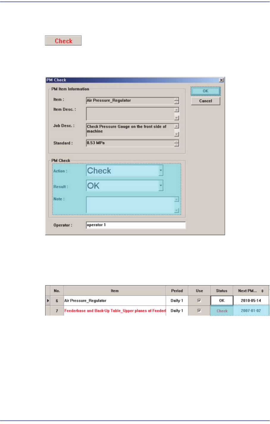 열이 “Check” 에서 “OK” 로 바뀌고 <Next PM> 열에 다음 PM Check 날짜로 갱