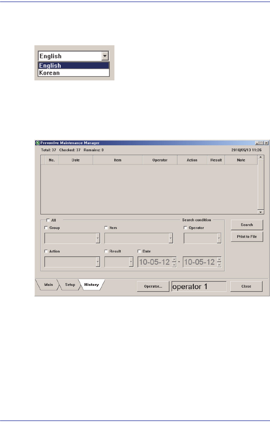 PM Manager의 사용자 인터페이스의 언어설정을 변경할 수 있습니다. Setup 화면에