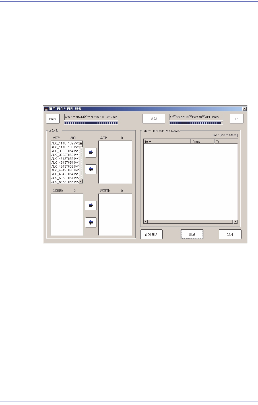 3-11 File 바로가기 메뉴 병합할 DB 파일을 선택합니다 . Tar g et DB 로 Local DB (UPD.mdb) 를 선택하십시 오 . <Compare> 버튼 두 DB 파일 을 비교하여 <Information> 영역에 Target DB 파일에 없는 부품 정보 는 <New:> 리스트박스에 보여주고 Target DB 파일에 동일한 부품명을 가진 부 …