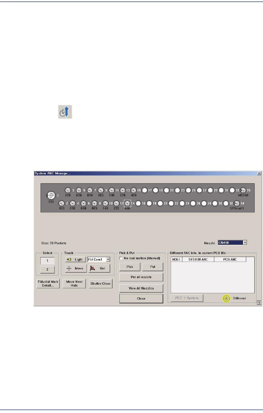 4-8 Samsung Component Place r SM471 Administrator's Guide 줌툴바를 감추거나 보 여줍니다 . 4.2.1.5. 디스플레이 윈도우 카메라의 실제 영상 , 그랩한 영상 , 비트맵 이미지 등을 보여줍니다 . 4.2.1.6. 상태바 화면의 확대비율을 출력합니다 . 4.3. ANC 설정 ANC(Auto Nozzle Changer) 에 설치되어 있는 …