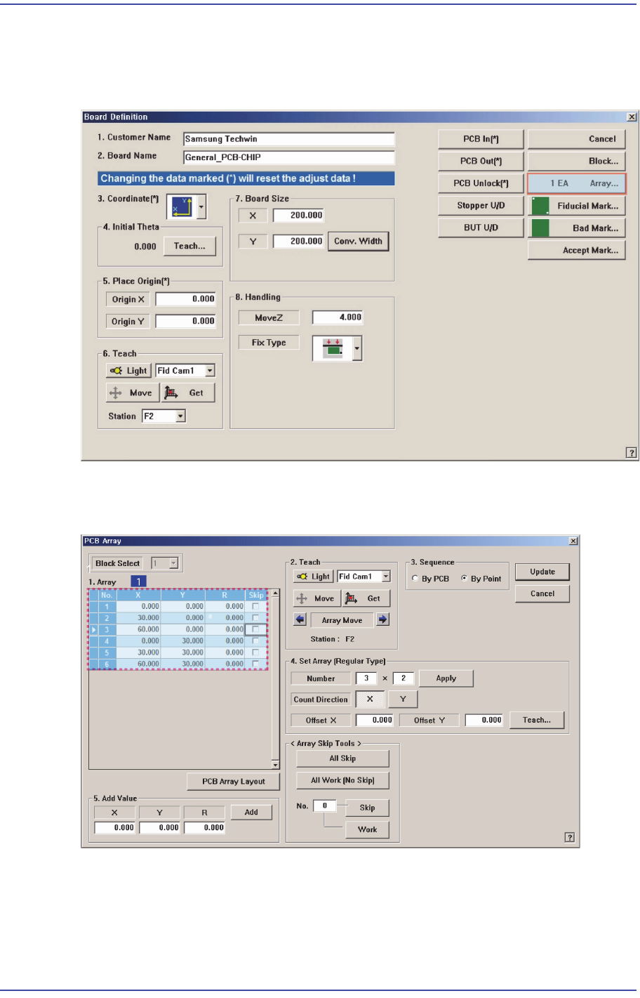 6-10 Samsung Component Place r SM471 Administrator's Guide “보드 정의” 대화상자에서 선택한 모델이 자동으로 선택되며 , 해당 콤보박 스는 비활성화됩니다 . Bloc k PCB 인 경우 설정할 모델을 선택 한 후 , 다른 항목들을 설정하십시오 . <1. Array> 영역 PCB 기판의 “ Place Origin ” 에 …