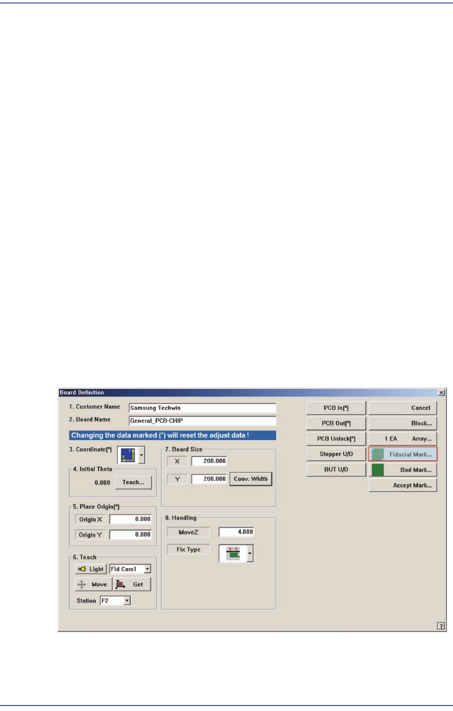 PCB기판에 Fiducial Mark가 있는 경우, Fiducial Mark의 위치와 Mark 데이터를 설정