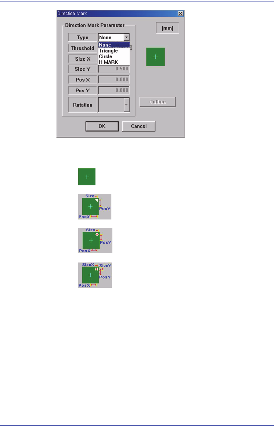 7-59 부품 등록 <Direction Mark Parameter> 영역 <Type> 콤 보박스 None: Direction Mark 가 없 습니다 . Triagle: Direction Mark 가 Triangle 일 때 선택 합니다 . Circle: Direction Mark 가 Circle 일 때 선택 합니다 . H MARK: Direction Mark 가 H…