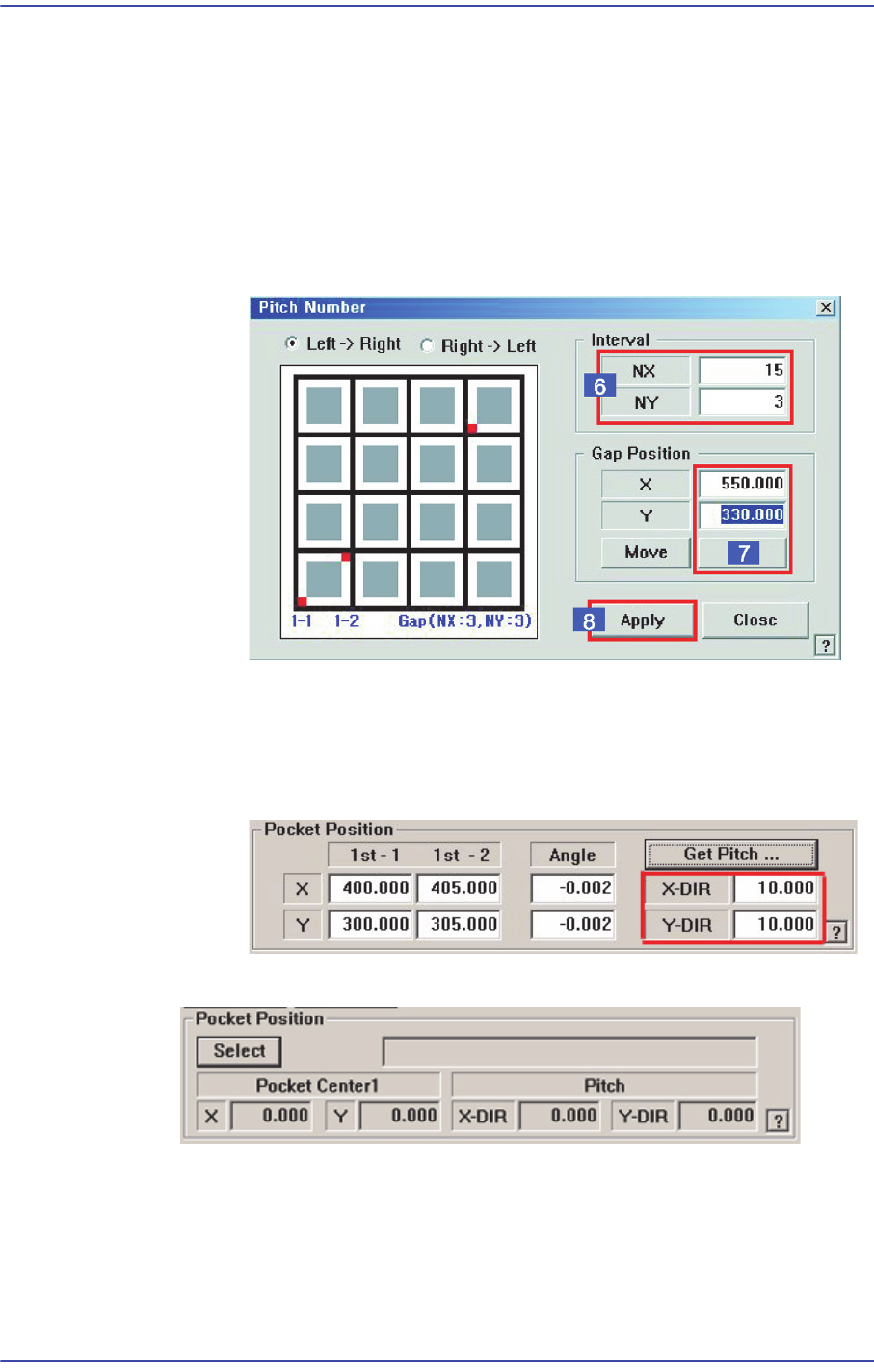 8-28 Samsung Component Place r SM471 Administrator's Guide (6) 피두셜 카메라가 최대한 이동 가능한 범위 내에서 피치 티칭을 할 포 켓을 선정하십시오 . 첫 번째 포켓과 멀리 떨어져 있는 포켓을 선택 할 수록 피치 값의 정밀도가 높아 질 수 있습니다 . 첫 번째 포켓과 피치 티칭 용 포켓 간의 간격 수 NX, NY 를 입 력하십 시오 …