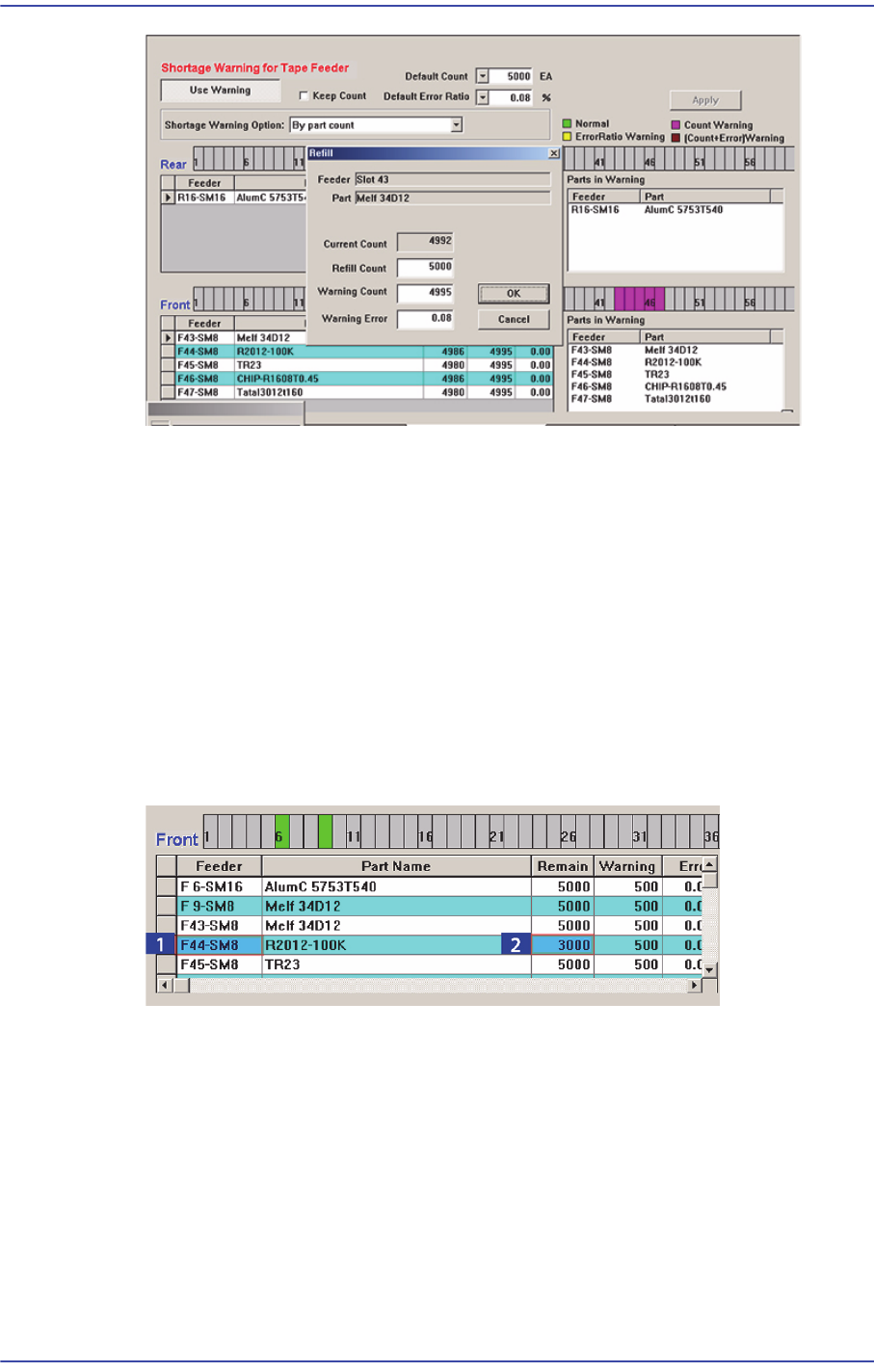 11-15 Production Setup Remain Count 를 기준 으로 Part Count 가 해당 퍼센트 이하가 되면 경고메시지 를 표시합니다 . 정상적인 Tape Fe eder 를 표시합니다 . 부품잔량이 설정 된 값 이하가 되는 Tape Feeder 를 표시합니다 . 부품공급 에러 발생율이 설정된 값 이상이 되는 Tape Feeder 를 표시합니다 . 부품잔량 부족…