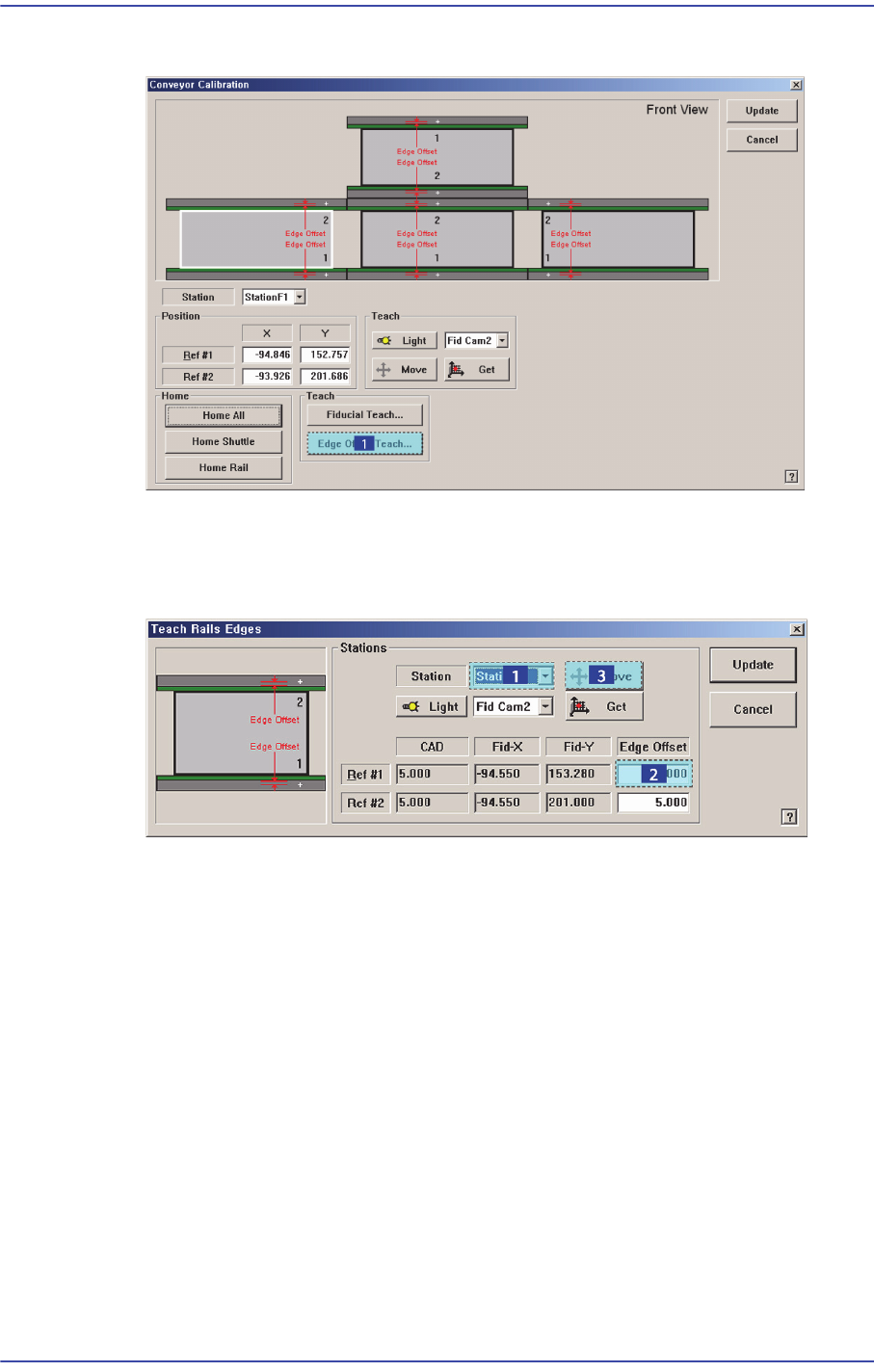 12-31 Machine Calibration 9. 일치되면 , <Get> 버튼을 클릭하십시오 . 10. 그리고 , Ref # 2 에 해당 하는 <Edge Offset> 에디트박스를 마우스로 선택하고 <Move> 버튼을 클릭하십시오 . 11 . 동일한 방법으 로 Ref#2 에 대해서 티칭을 실시하십시오 . 12. 선택된 St ation 의 Fiducial Ma…