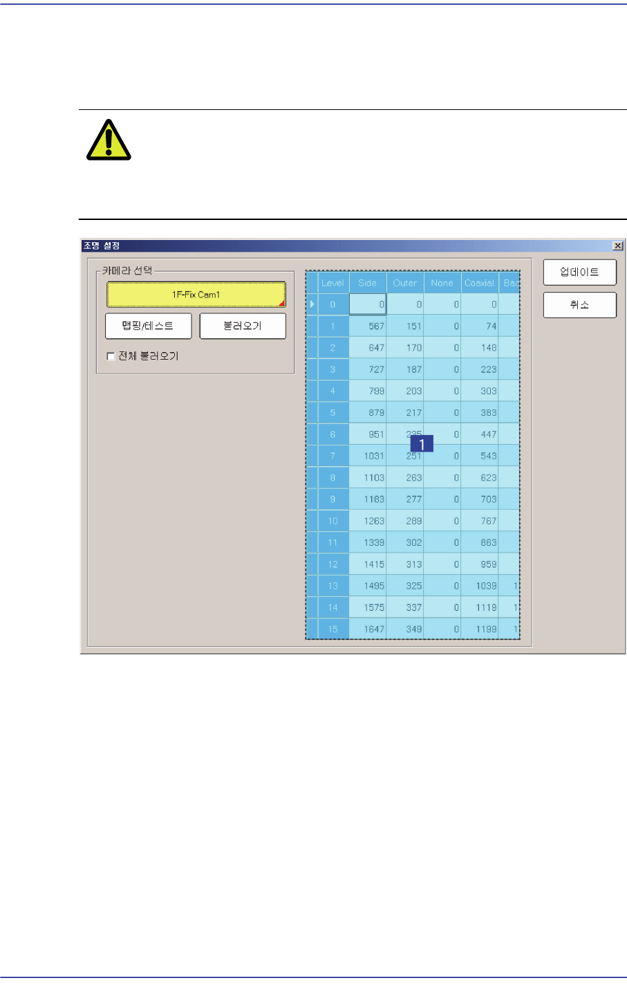 12-55 Machine Calibration 조명의 16 단계를 표 시합니다 . <S ide>/ <Outer> /<Coaxial> 열 Fly Cam 인 경우 : Side 조명 이 256 값의 범위 내에서 입력됩니다 . < 맵핑 / 테스트 > 버튼 < 카메 라 선택 > 콤보박스박스에서 선택된 카메라에 대해서 Light Level…