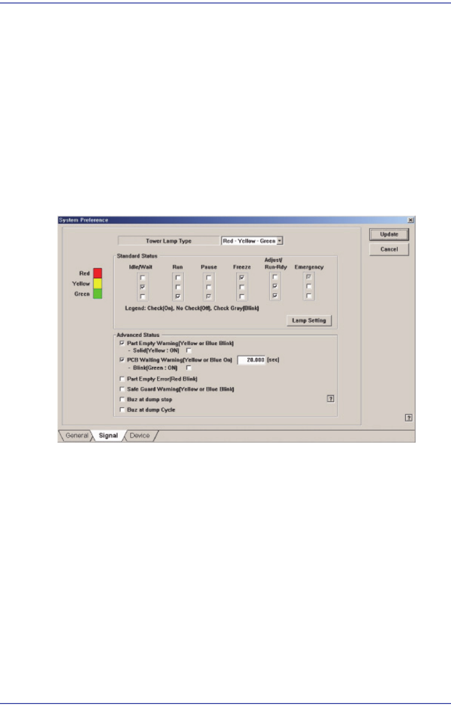 13-26 Samsung Component Place r SM471 Administrator's Guide 잠시 정지된 상태입니다 . 적색등 점멸 시 장비가 EMERGENCY 상태로 , 작업 중 Emerge ncy 에러가 발생하여 장비가 정지 된 상태입니다 .