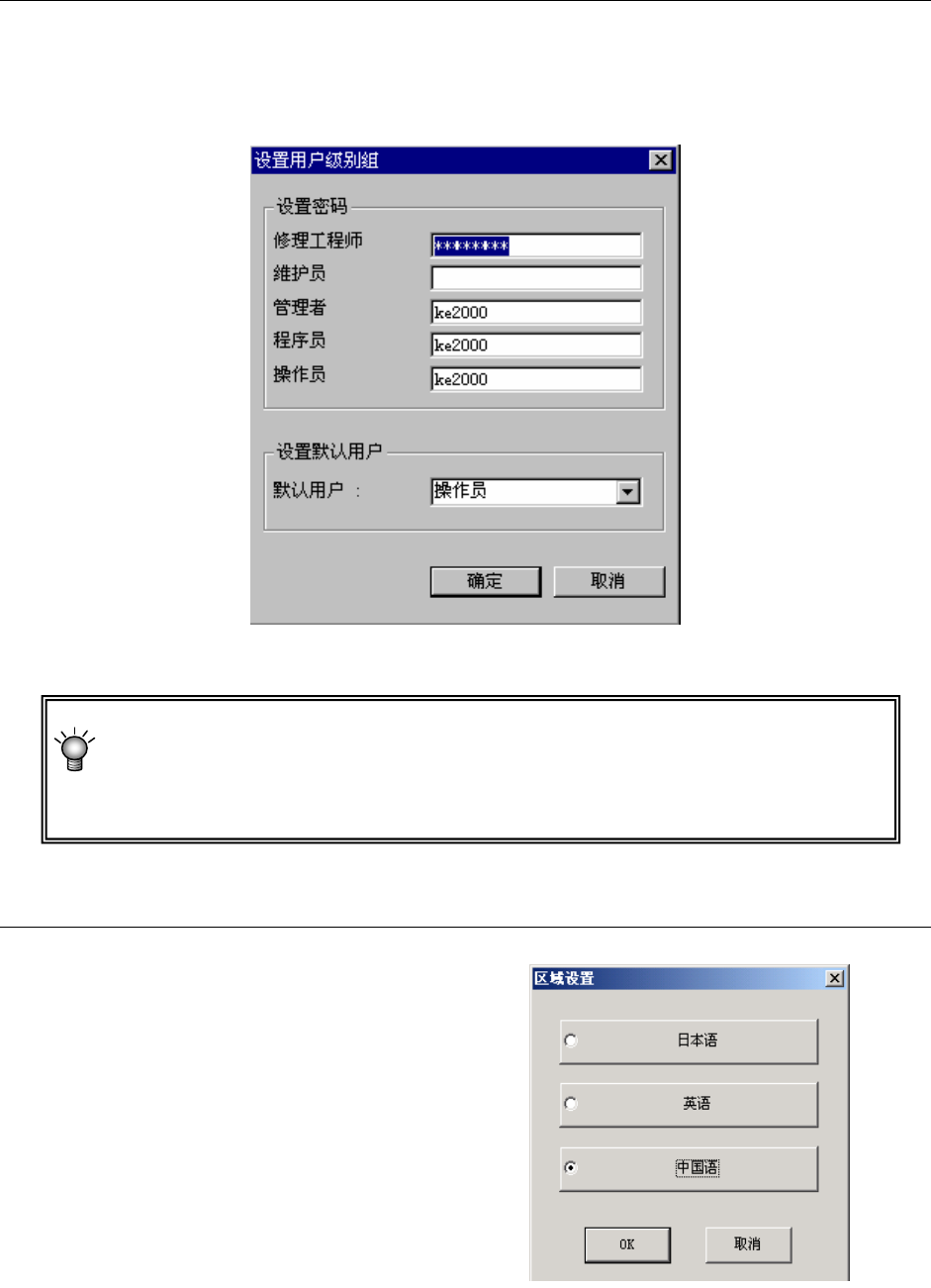 改变用户组时,要设置发生变动的用户密码。也可设置默认用户 (参见4-2-1-1 用户组变更、