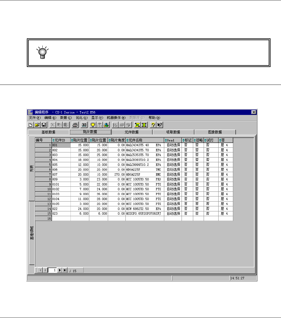制作基板数据后,单击画面上方的“贴片数据”标签,显示贴片数据制作画面(下图为制作完
