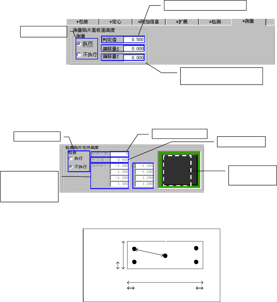 测量元件的贴片位置的基板面高度,进行贴片 Z 坐标的校正。测量位置为贴片点的中心(1 点)。