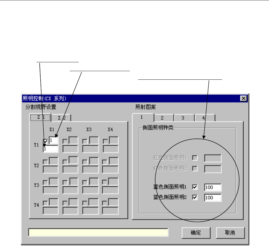 第 4 章 生产程序制作 4-85 4-3-7-5 照明控制数据 可指定用VCS识别时的照明控制(下图为不进行分割识别时的例子)。 ① 分割视野设置 在进行分割识别时,显示其等分数(目前最大为 4 次)。 “Z2”现在没有使用。 照射图案的编号 (照射图案有多个时,指定其编 号)。 分割识别时的识别顺序 。 画面显示因照明的种类而不同。 图 4-3-35 照明控制数据 ② 指示灯图案 可设置各 LED 的亮度。 亮度以 100 为基准、…