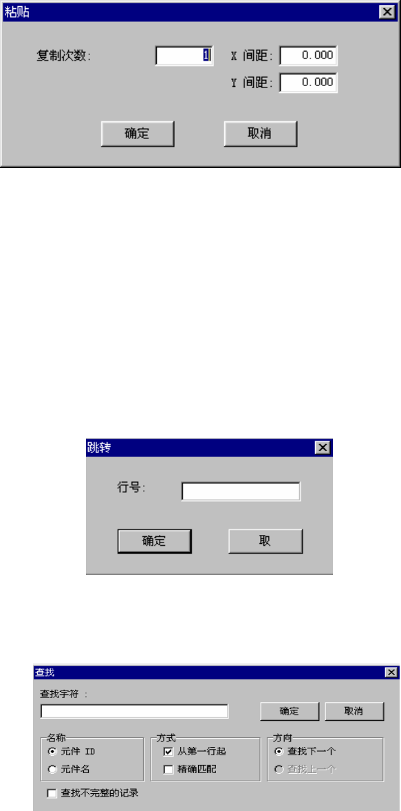 第 4 章 生产程序制作 4) 粘贴 粘贴用上述的复制命令选择的范围。 选择粘贴命令,则显示以下画面。 图 4-5-2 粘贴对话框 ①复制次数 :指定复制次数。 ②X 间距 :指定 X 方向的贴片位置的增加部分或减少部分。 ③Y 间距 :指定 Y 方向的贴片位置的增加部分或减少部分。 ④确定 :执行粘贴。 ⑤取消 :中止粘贴。 5 ) 插入行 插入空白行。 6) 复制并插入 将光标所在行复制插入到下一行。 7) 跳转 选择跳过命令,则显…