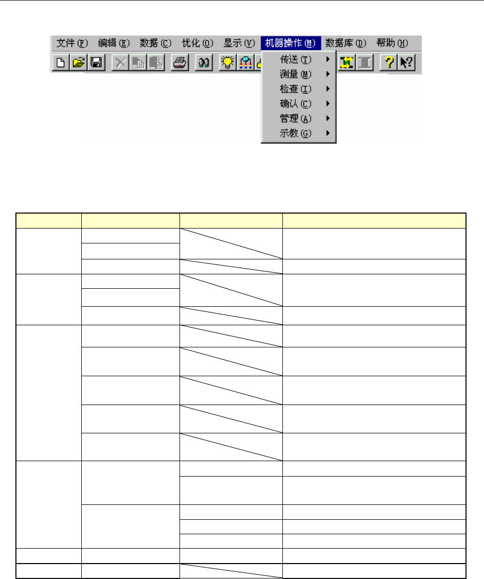 第 4 章 生产程序制作 4-5-4 机器操作 进行使主体实际动作的各种操作。菜单项目根据各种操作而不同。 图 4-5-23 机器操作的选择画面 以下显示各菜单项目的子菜单及功能概要。 菜单项目 子菜单 1 子菜单 2 概要 基板搬入 基板搬出 将基板搬入或搬出主体。 传送 自动基板宽度调整 调整基板宽度 单独 连续 检测元件数据的各详细值。 检测 贴片基板面高度 检测贴片数据的贴片基板面高度。 图像识别 检查是否为可进行图像识别的数据…