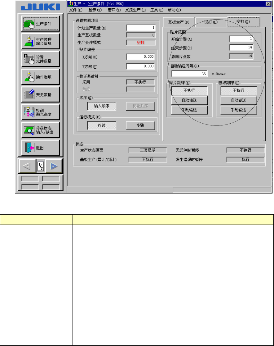 第 2 章 生产 3) 空打 图 2-23 设定空打条件 No. 项目 内容 1 贴片范围 (步骤号) 需限定贴片范围时, 请输入开始步骤号和结束步骤号。在 总贴片点数 项中显示每 1 电路中的总贴片步骤号。仅能指定输入顺序。 2 自动输送间隔 自动传送跟踪时,请设定在停止位置上 的停止时间。 以 10msec(0.01 秒)为“1”个单位。 3 贴片跟踪 空打基板后,对是否利 用摄像机进行贴片点的跟踪, 以及跟踪时是自 动传送还是手…