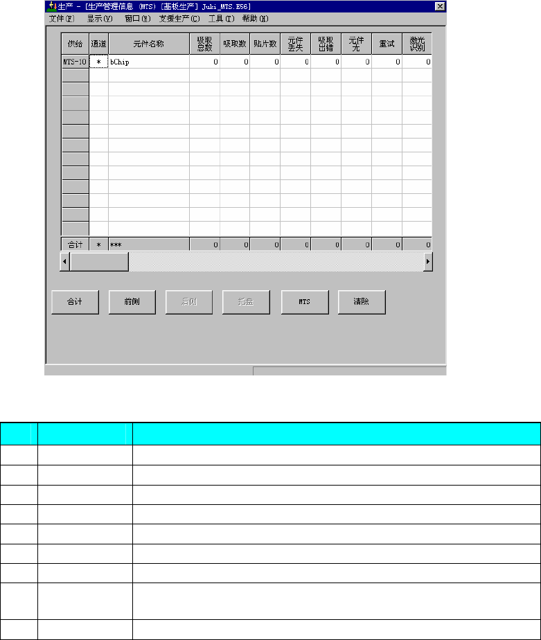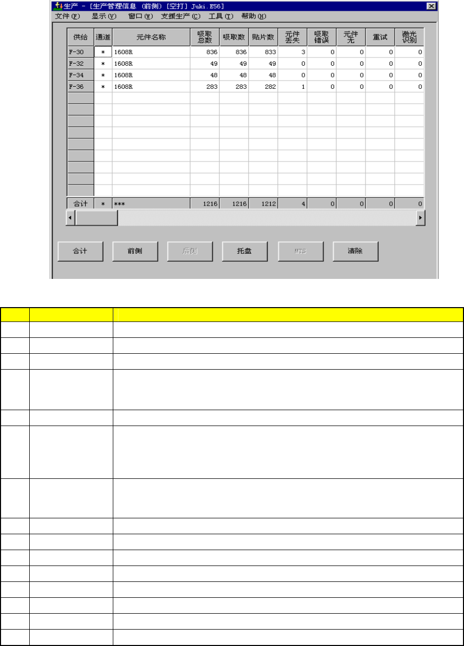 第 2 章 生产 ② 各供给装置的管理信息 显示各供给装置的生产管理信息。 请从前面、后面、托架(DTS)、MTS中选择。 当选择前面时,显示如下画面。 图 2-32 生产管理信息(前面) No. 项目 内容 1 总吸取次数 该供给装置中进行吸取动作的次数。 2 吸取数 该供给装置中成功吸取元件的数量。 3 贴片数 从该供给装置吸取且贴片的元件数。 4 元件损失 该供给装置中损失的元件数。 (总吸取次数 - 重试 × (元件数据的重试…