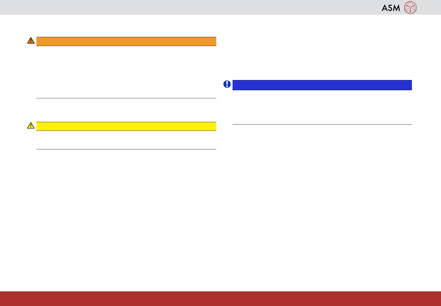 www.asm-smt.com 维护任务的安全须知 警告 燃烧的危险 在靠近明火或火焰的地方进行清洁时切勿使用酒精等可燃性液体。 切勿在靠近明火或火焰的地方使用气雾罐喷洒润滑剂或清洁剂。 . 注意 乙醇 在使用浓缩乙醇清洁设备模块时务必始终佩戴护目眼镜和手套。 如有乙醇不慎进入眼部,请立即用清水冲洗眼睛。 . 注意 清洁和润滑 始终使用乙醇进行清洁——切勿使用任何溶剂。 异丙醇——可以使用 IPA(异丙醇)作为替代品。 切勿…