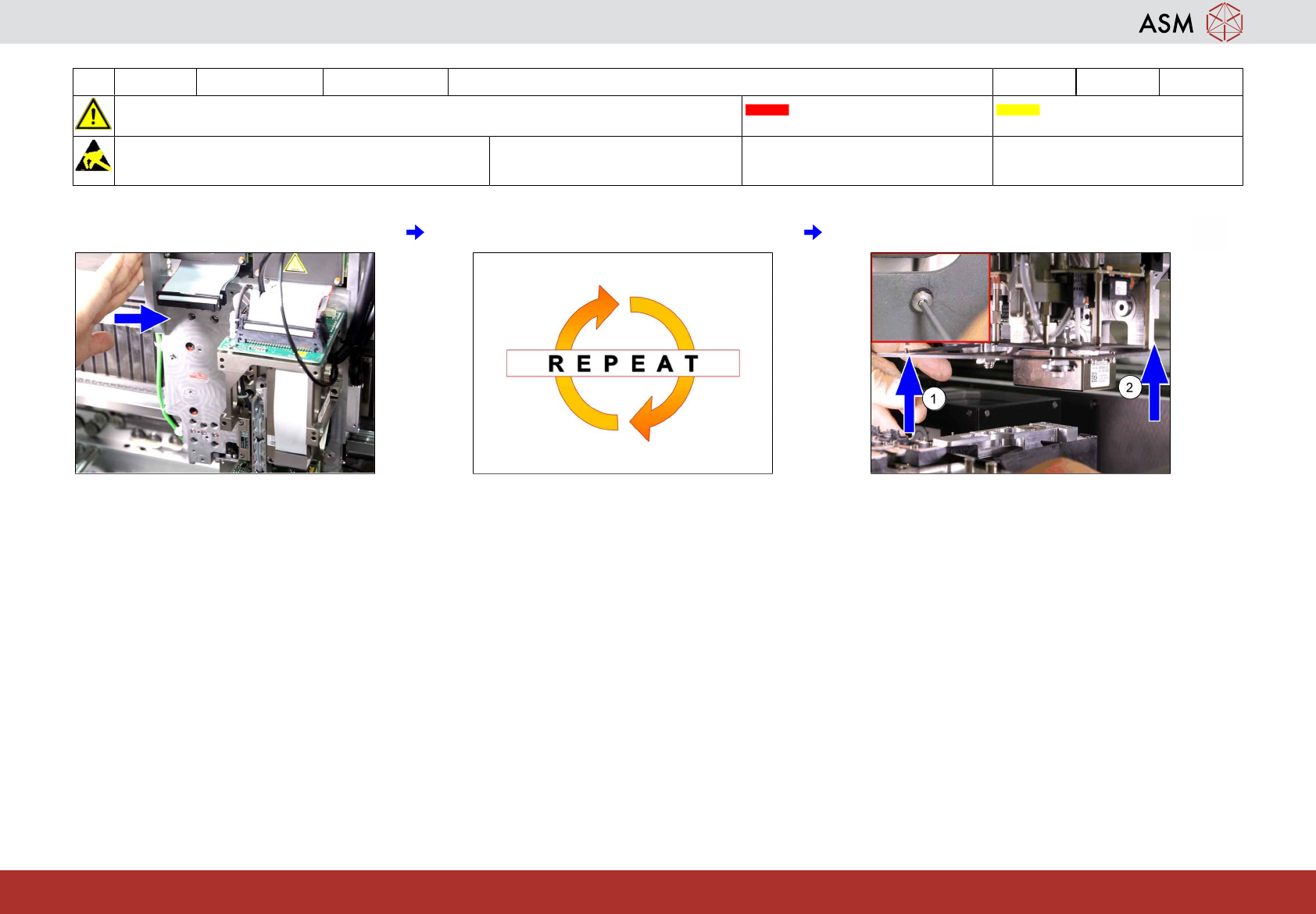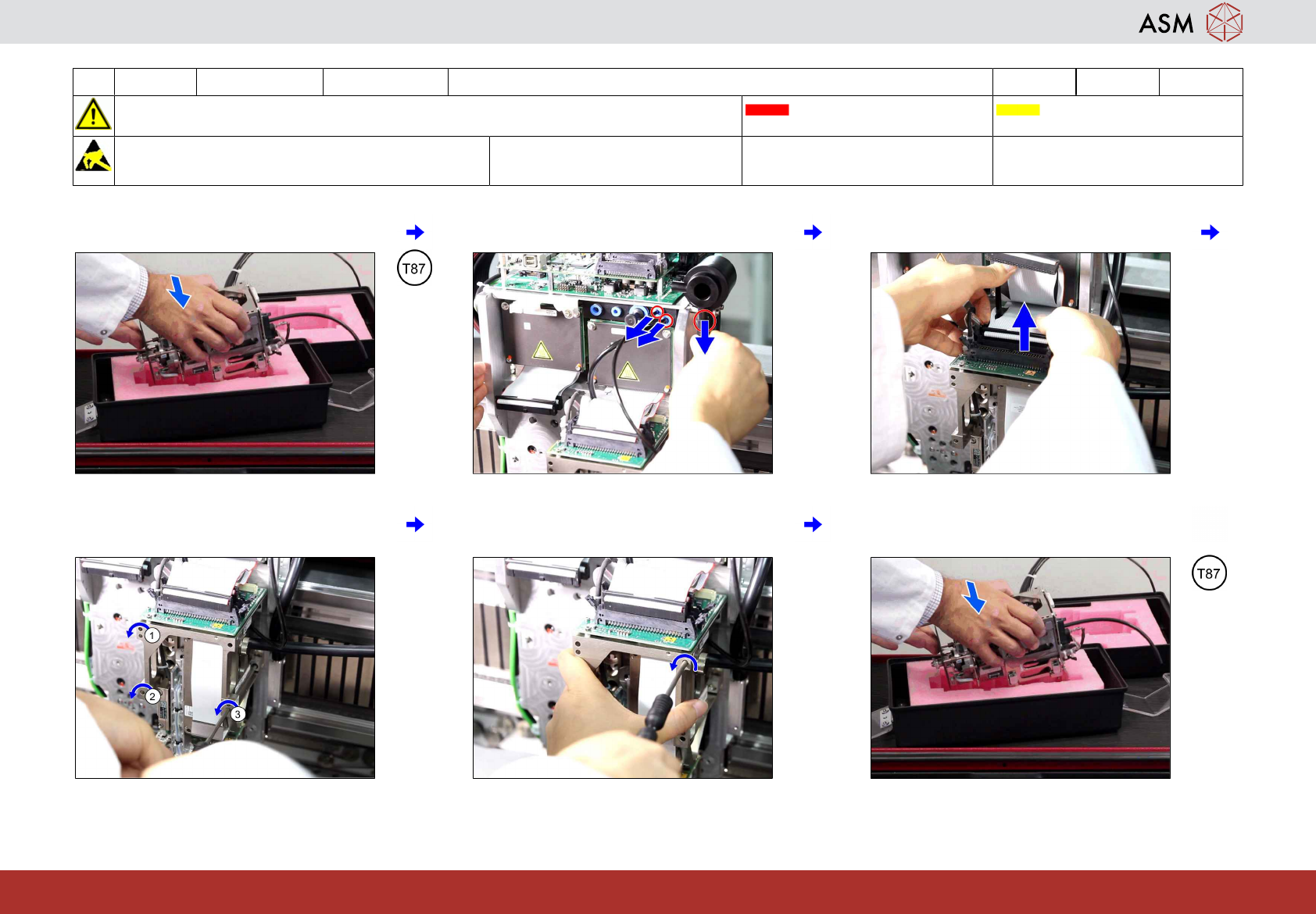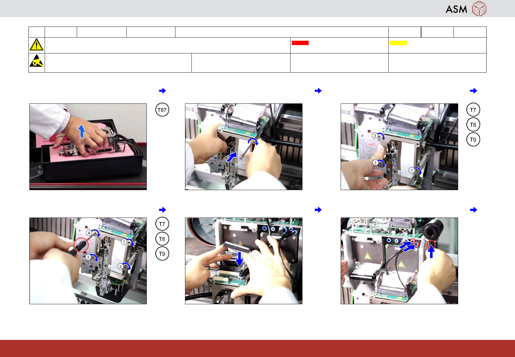 6 WF 4 TX 系列 维护 放回已维修好的 TH 10 分钟 1 / 2 注 意 开 始 维 护 前 , 请 参 阅 用 户 手 册 中 的 安 全 说 明 贴片机状态 关闭 传送导轨空 注意!遵守防静电守则 工具: T7、T8、T9、T87 易损件: 耗材: www.asm-smt.com 1 将右侧贴片头段位器从运输容器中取出。 2 放置段位器贴片头支座并用一颗螺钉稍微 固定。 3 稍微上紧 (1) 号和 (3) 号位置上的…