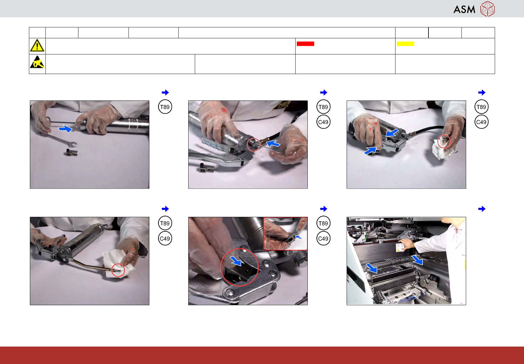 8 WF 4 TX 系列 维护 润滑引导轴承,清洁线性引导装置以及 Y 轴的刻度 5分钟 1 / 4 注 意 开 始 维 护 前 , 请 参 阅 用 户 手 册 中 的 安 全 说 明 贴片机状态 关闭 传送导轨空 注意!遵守防静电守则 工具: T89 易损件: 耗材: C3、C5、C49 www.asm-smt.com 1 将阀门推杆拉回到锁定位置。 2 拧开顶部的螺钉。 3 准备好弹筒式润滑脂(若配备)。 4 将弹筒式润滑脂插入…