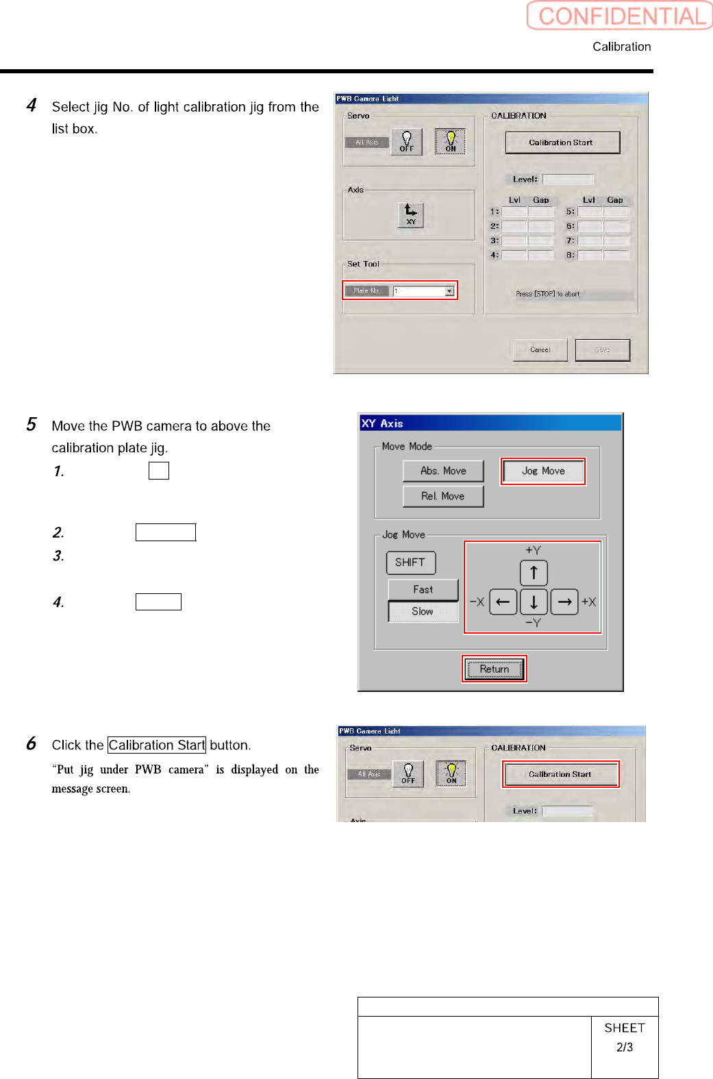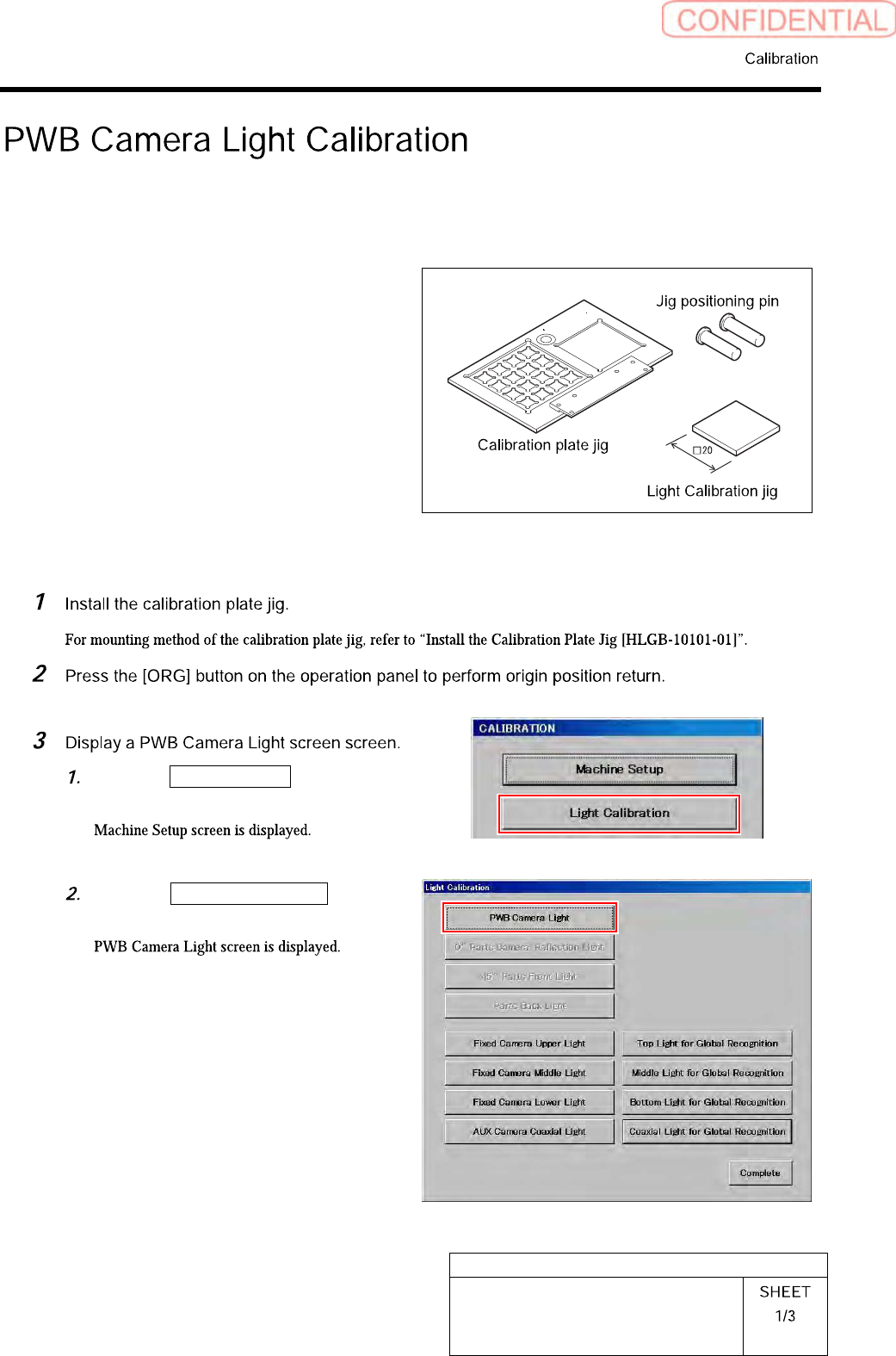 HLGB-10301-01 PWB Camera Light Calibration Perform this working on b o th he ads on t he front side and rear side. [Necessary jigs] • C al i bration plate jig • J i g positioning pin • Light Calibration jig [Procedure] C…