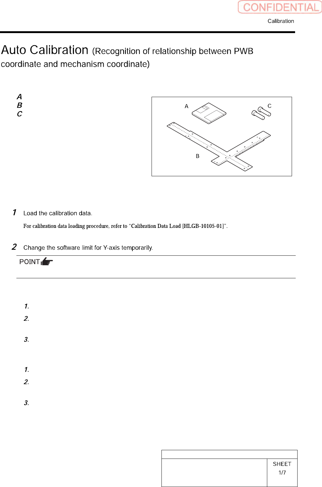 HLGB-10304-01 Auto Calibration (Recognition of relationship betw een PW B coordinate and mechanism coordinate) [Necessary jigs] Calibration data FD Ball point jig Positioning pins for ball point j ig [Procedure] Make sur…