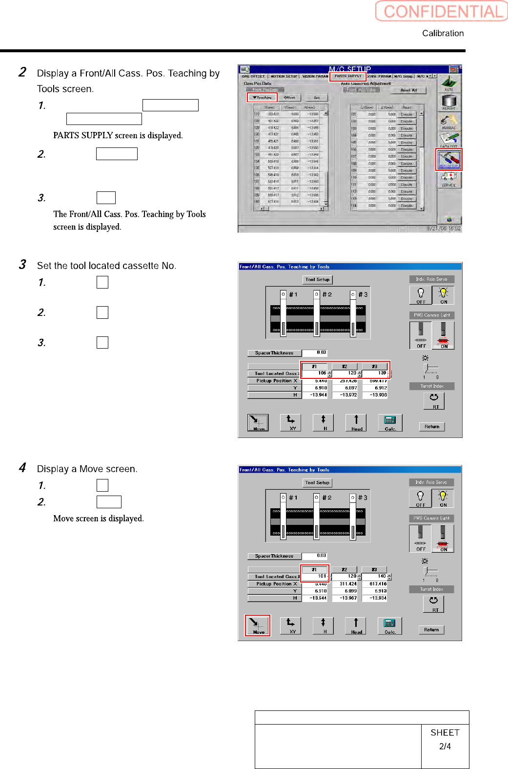 HLGB-10312-01 Checking Pickup Position Click in an order of M/C SETUP menu  P ARTS SUPPL Y tab. Click the T eaching button o n the Front Pos. Data to display a drop down menu. Click the Jigs in the drop d own menu. Clic…