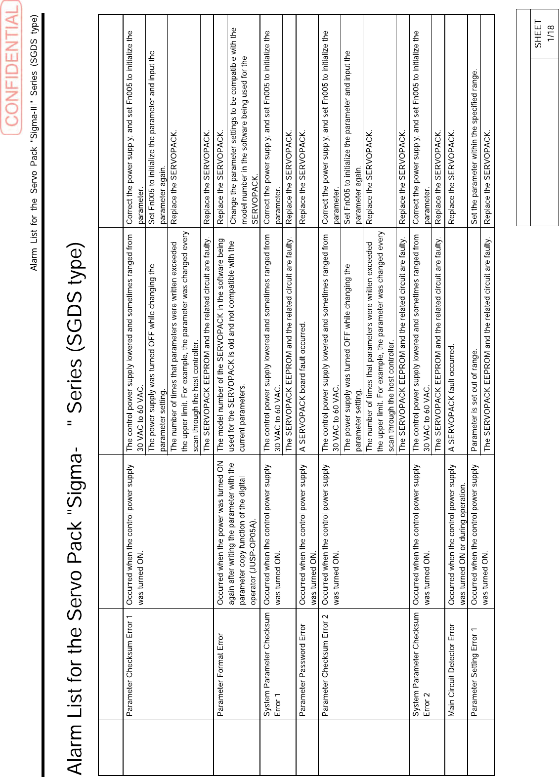 BBGB-10101-01 Alarm List for the Servo Pack "Sigma-III" Series (SGDS type) III Alarm Display Alarm Name Situation at A l arm Occurrence Cause Corrective Actions A.020 A.021 A.022 A.023 A.02A A.02b A.030 A.040