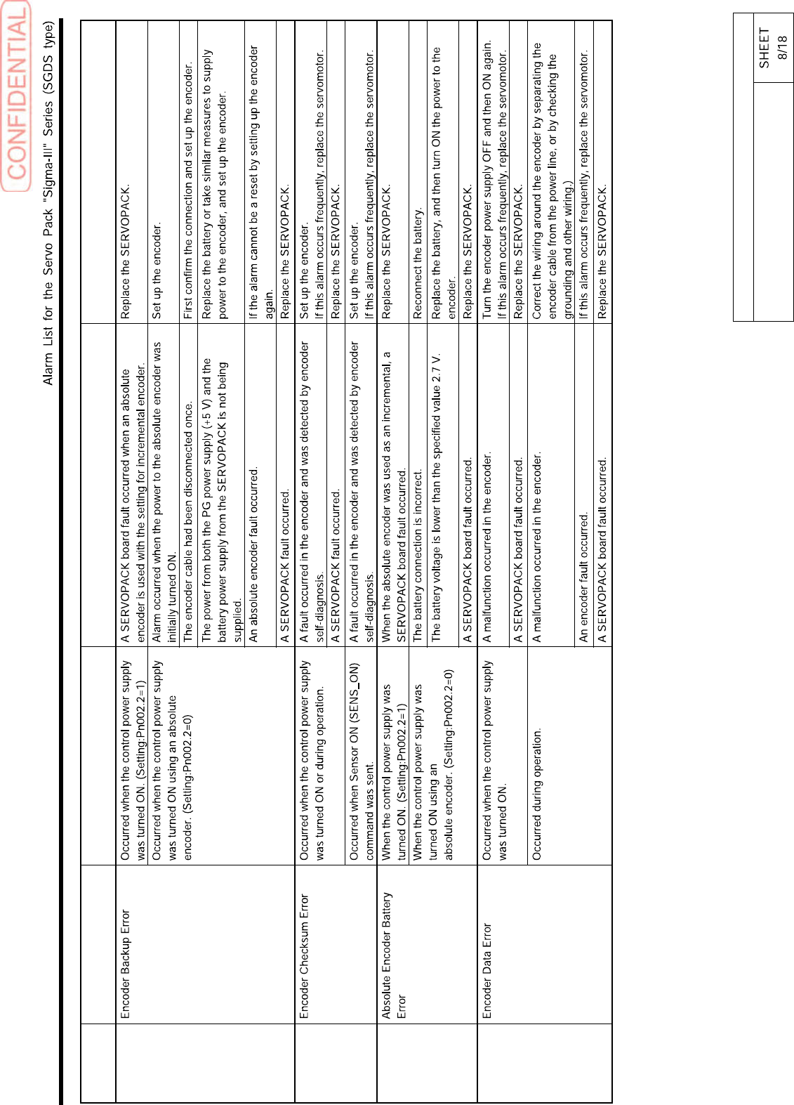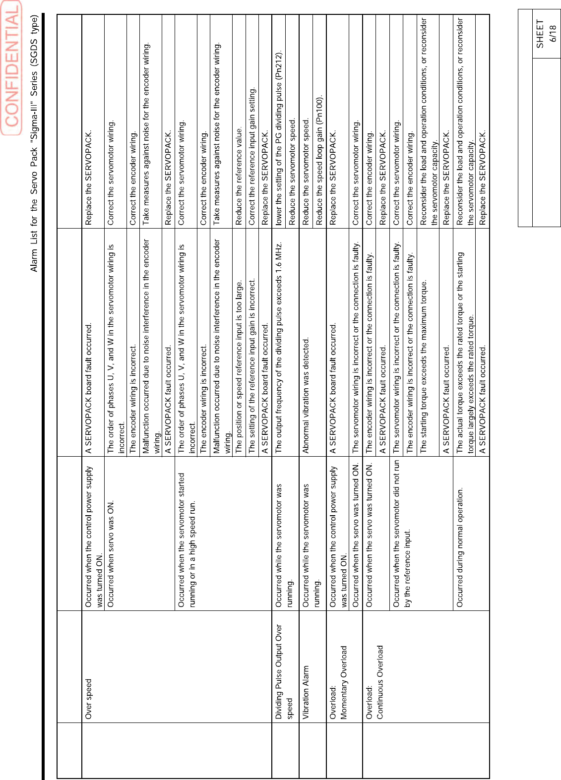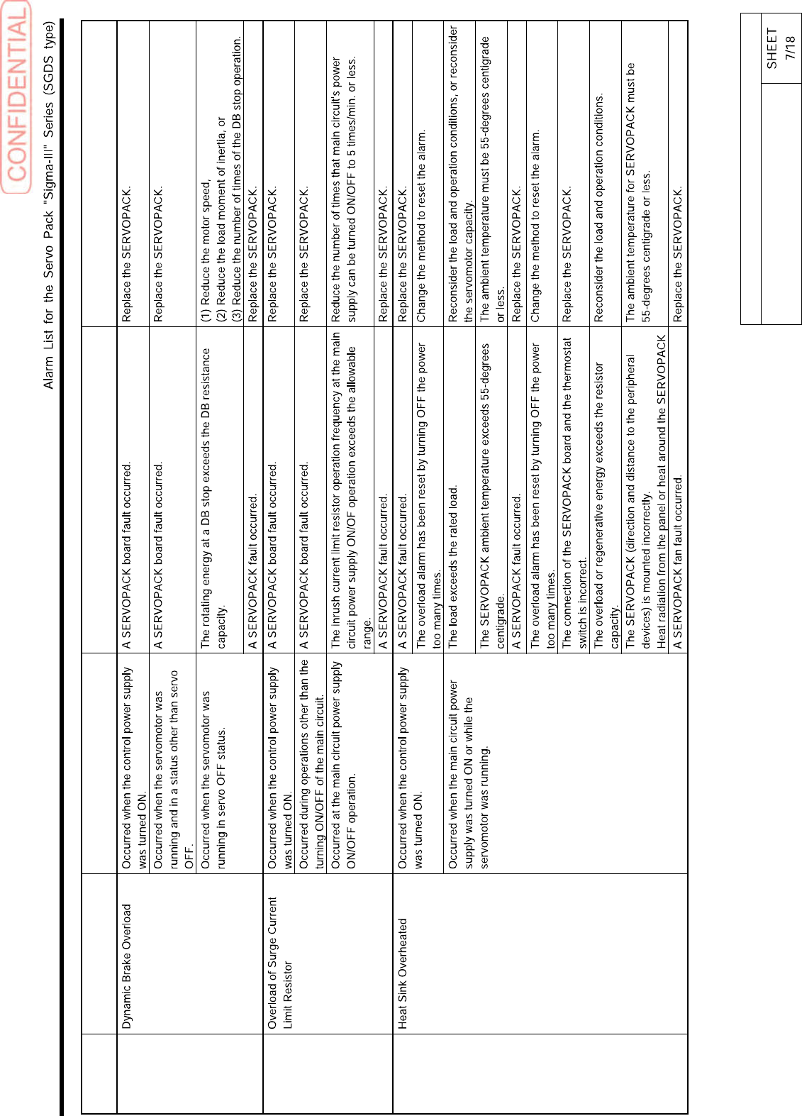BBGB-10101-01 Alarm List for the Servo Pack "Sigma-III" Series (SGDS type) Alarm Display Alarm Name Situation at A l arm Occurrence Cause Corrective Actions A.730 A.740 A.7A0