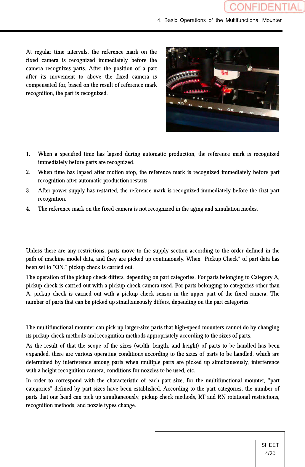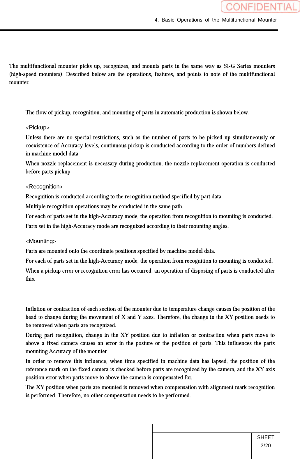 TFGB-10101-01 SI-G200 (B Head) Ov e rview 4. Basic Operations of the Multifunction al Mounter 4-1 Operations in Automatic Production 4-2 Fixed Camera Recog niti on Mark