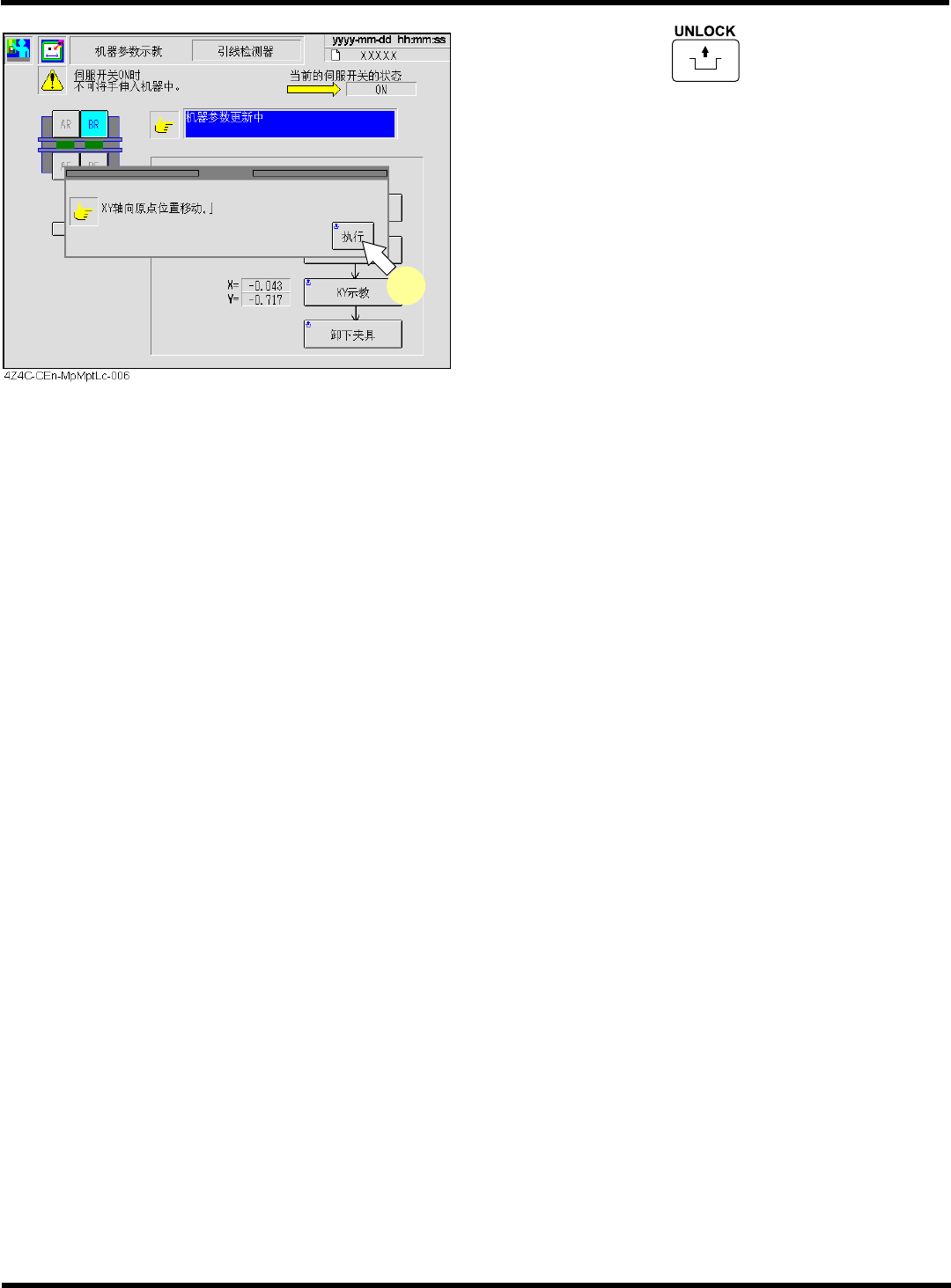 CM602-L 维修手册 2.2 机器参数的示教步 骤 Page 2-1 37 11. 按操作面板上的 + [ 卸下夹具 ] 。 12. 将伺服开关置于 OFF (O) 。 13. 打开安全盖。 14. 取下量具。 15. 关闭安全盖。 16. 将伺服开关置于 ON ( I ) 。 ∗ 重复步骤 2. ~ 16. 的操作, 请对其它 工作台也要 进行同样的操作。 17. 按功能键 。 下一页 O FF ( ) ON ( ) S E RV…