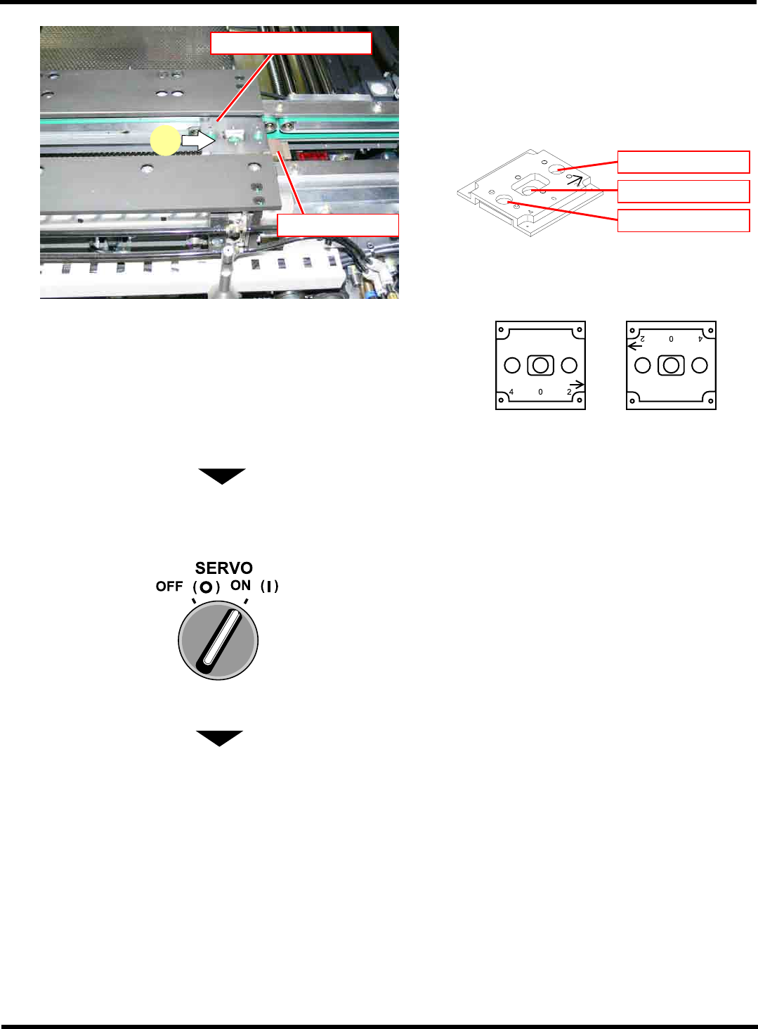 CM602-L 维修手册 2.2 机器参数的示教步 骤 Page 2-1 41 6. 将基板弯曲传感器治具设置在第 1 实装位 置。 ∗ 请紧贴在基板止动器。 基板弯曲传感器治具 ∗ 为使基板弯曲传感器治 具上的箭头位于如下 图 所示的位置,设置传感 器。 前侧 前侧 由左至右流向 外侧基准 内侧基准 由右至左流向 外侧基准 内侧基准 7. 关闭安全盖。 8. 将伺服开关置于 ON ( I ) 。 下一页 EJM8A- C-MMB02-…