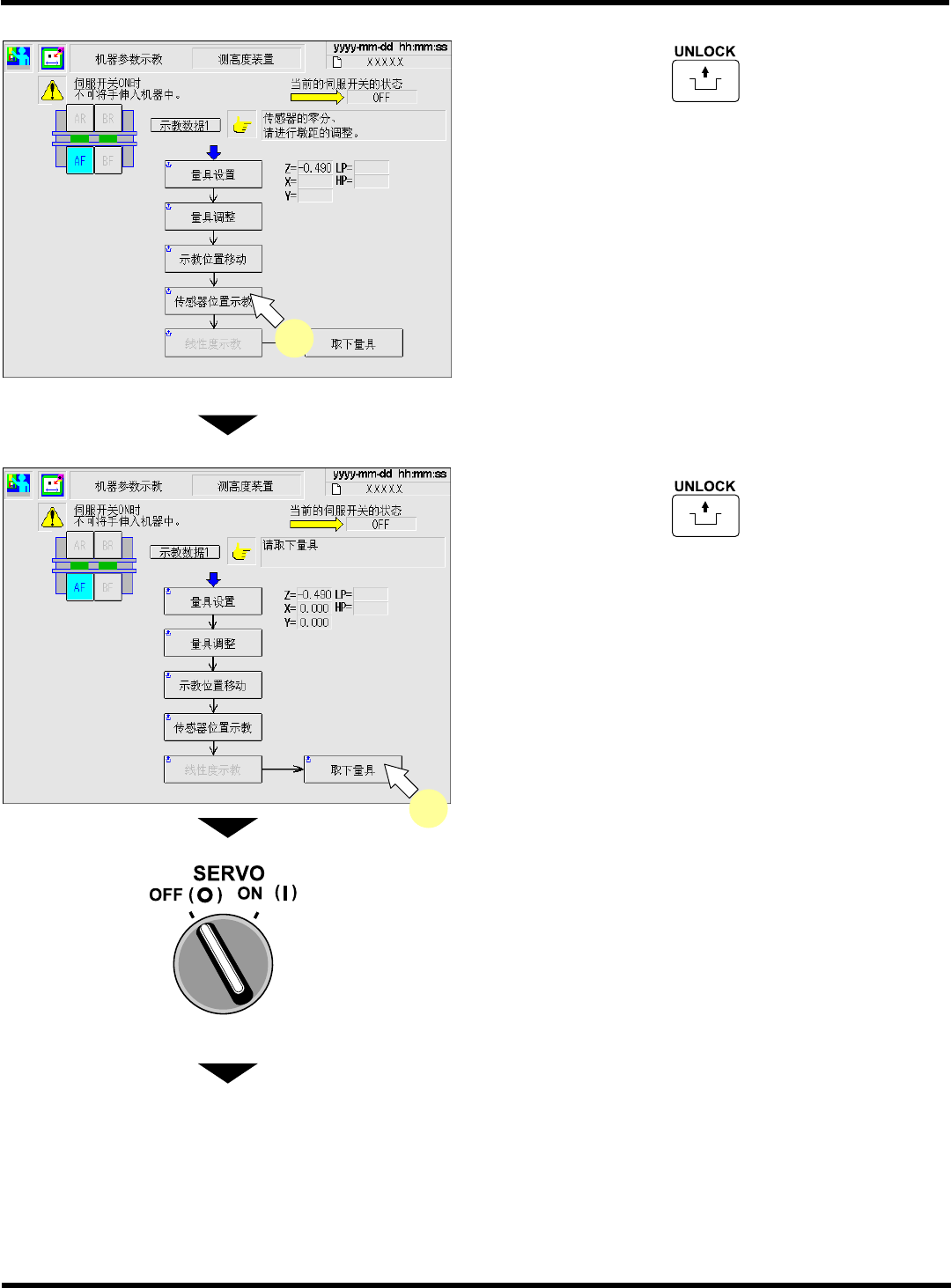 CM602-L 维修手册 2.2 机器参数的示教步 骤 Page 2-1 46 21. 按操作面板上的 + [ 传感器位置 示教 ] 。 • 将取得基板弯曲传感器 的照射光位置的 XY 坐 标。 22. 按操作面板上的 + [ 取下量具 ] 。 • 移载吸头将会移至退避 位置。 23. 将伺服开关置于 OFF (O) 。 24. 打开安全盖。 25. 将基板弯曲传感器治具从基板支座上取 下。 下一页 EJM8A- C-MMB02- A0…