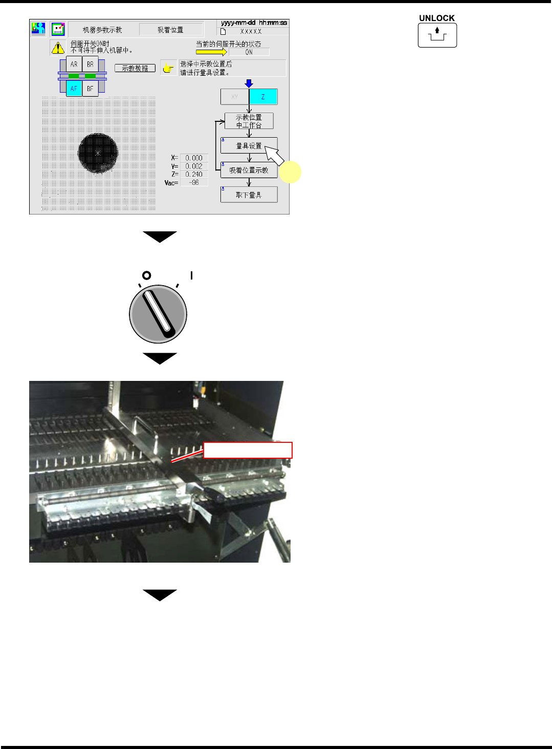 CM602-L 维修手册 2.2 机器参数的示教步 骤 Pa ge 2- 94 9. 关闭安全盖。 10. 将伺服开关置于 ON ( I ) 。 11. 按操作面板上的 + [ 吸着位置示 教 ] 。 12. 按 [ 示教位置左工作台 ] 。 • 画面的显示将会切换为 ‘ 示教位置中工 作台 ’ 。 下一页 O FF ( ) ON ( ) S E RVO EJM4A -Mp-0108 11 EJM4A -Mp-0109 12 EJM8A…