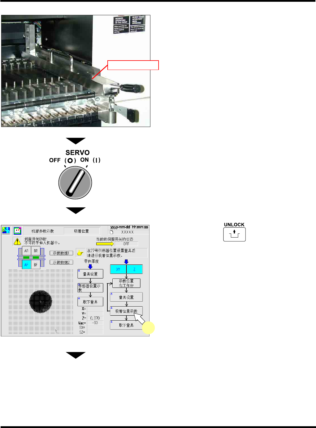 CM602-L 维修手册 2.2 机器参数的示教步 骤 Page 2-1 05 20. 按 [ 示教位置中工作台 ] 。 • 显示将会切换为 ‘ 示教位置右 工作台 ’ 。 21. 按操作面板的 + [ 量具设置 ] 。 22. 将伺服开关置于 OFF (O) 。 23. 打开安全盖。 下一页 EJM8A- C-MMB02- A03-00 EJM8A -Mp-0026 20 EJM8A -Mp-0027 21