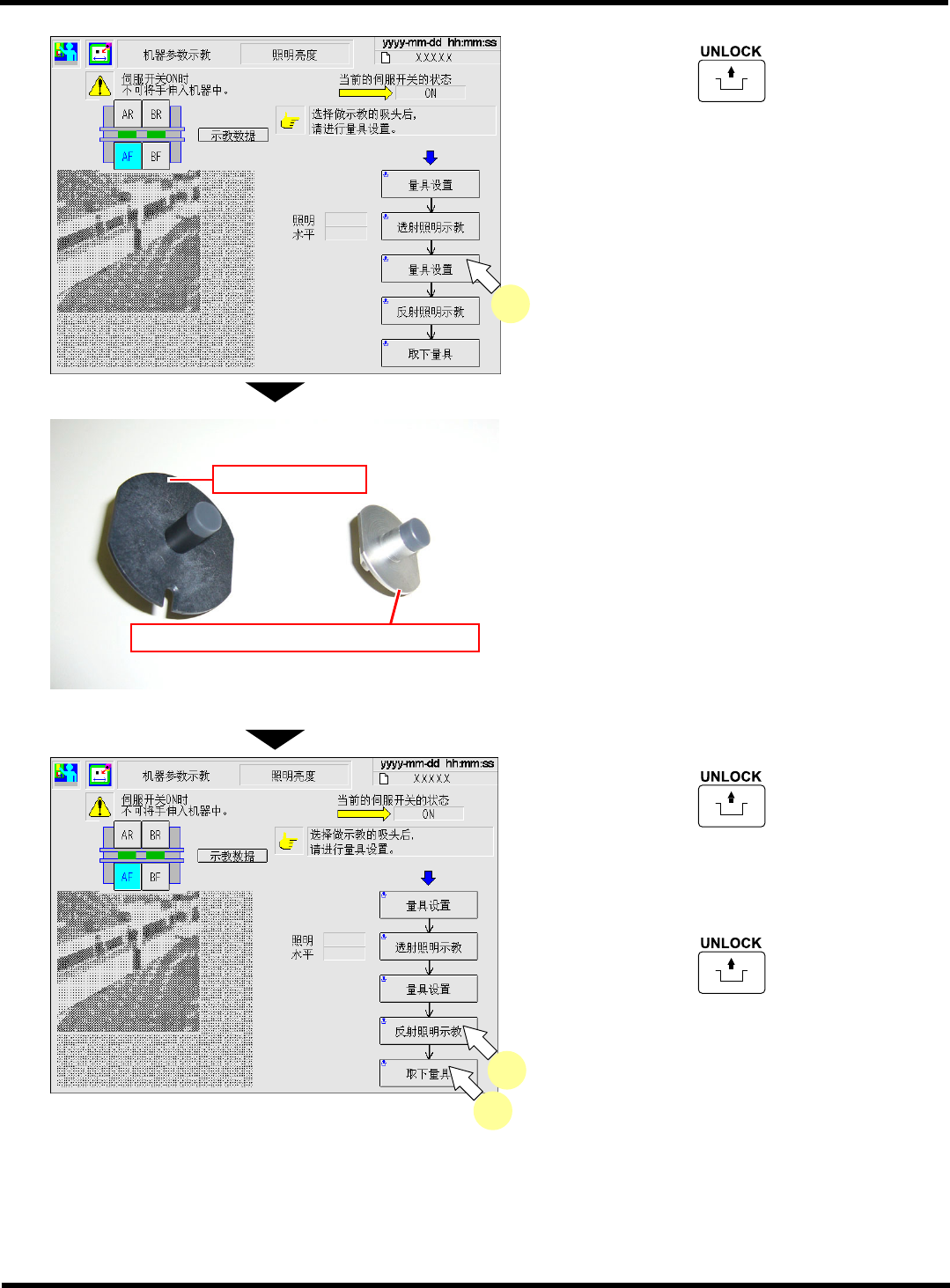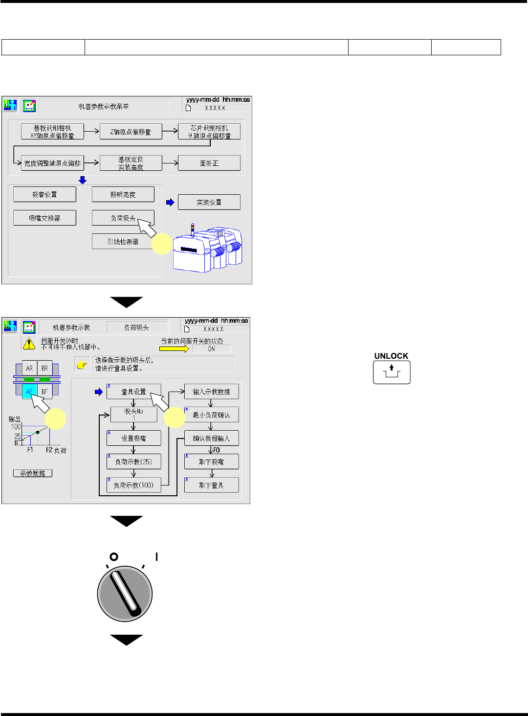 CM602-L 维修手册 2.2 机器参数的示教步 骤 Page 2-1 20 2.2.10 负荷吸头 ( 多功能吸头 ) 使用工具 1003 号吸嘴、负荷测定量 具 ( 选购件 ) (N61 0004084A A) 需要时间 15 分钟  前期准备 ∗ 请拆卸所有的支撑销。 1. 按 [ 负荷吸头 ] 。 • 传送带宽度将被设定为 80 mm 。 2. 选择要进行示教的工作台。 3. 按操作面板上的 + [ 量具设置 ] 。 4. …
