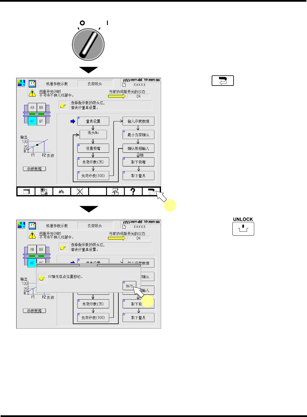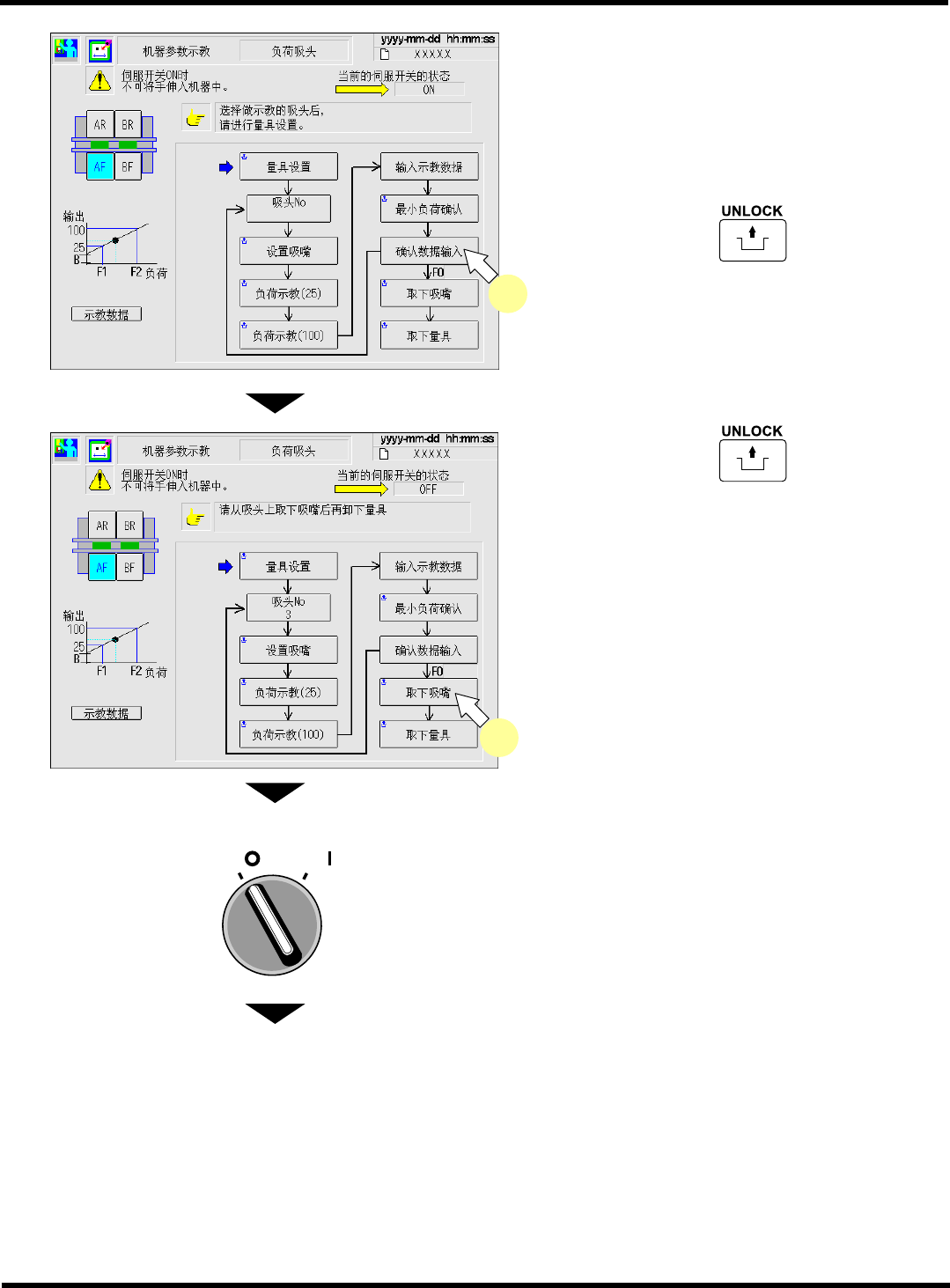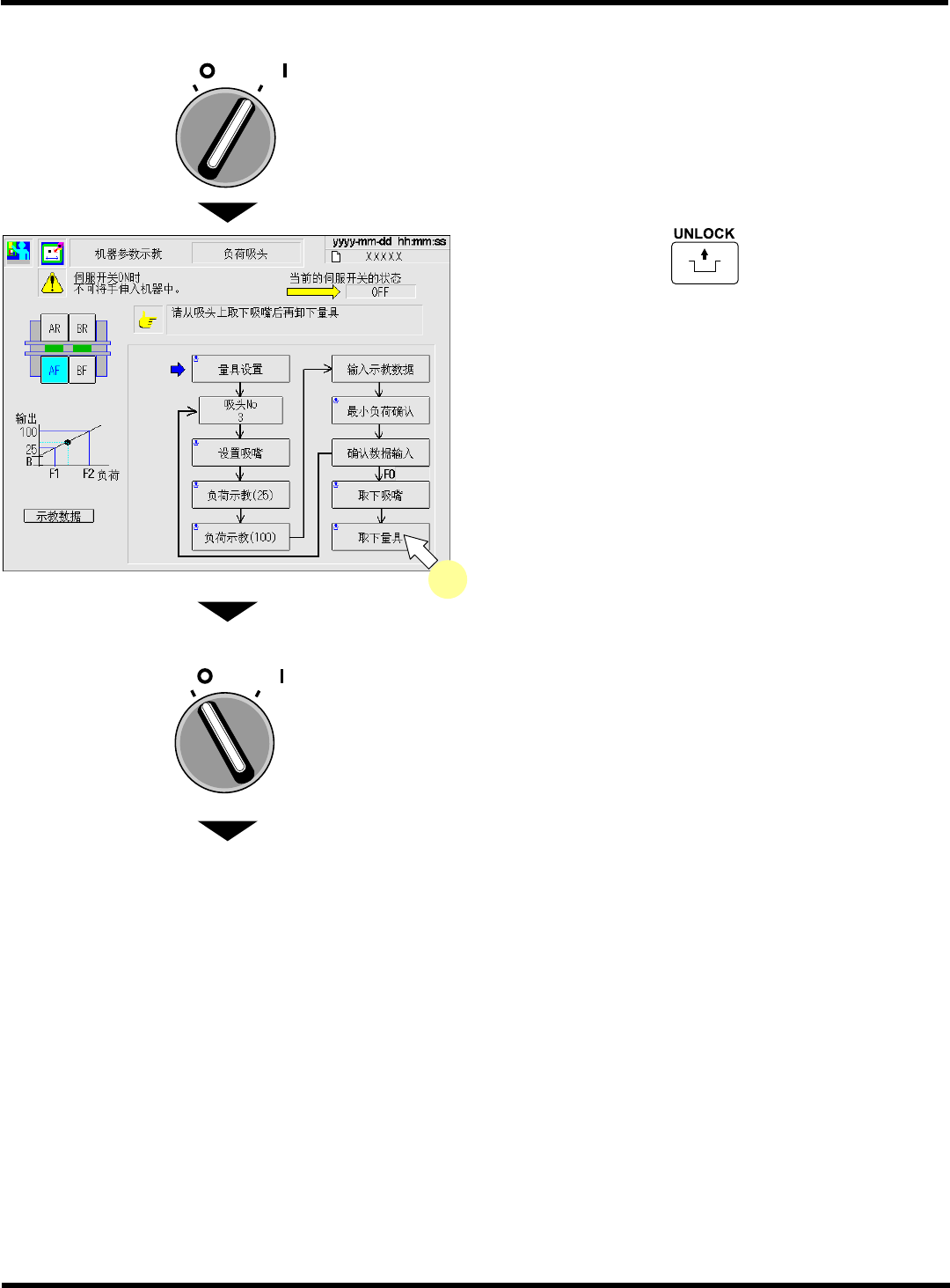 CM602-L 维修手册 2.2 机器参数的示教步 骤 Page 2-1 26 33. 关闭安全盖。 34. 将伺服开关置于 ON ( I ) 。 35. 按操作面板上的 + [ 取下量具 ] 。 36. 将伺服开关置于 OFF (O) 。 37. 打开安全盖。 38. 取下负荷测定量具。 下一页 O FF ( ) ON ( ) S E RVO OFF ( ) ON ( ) S E RVO EJM8A- C-MMB02- A03-00 …