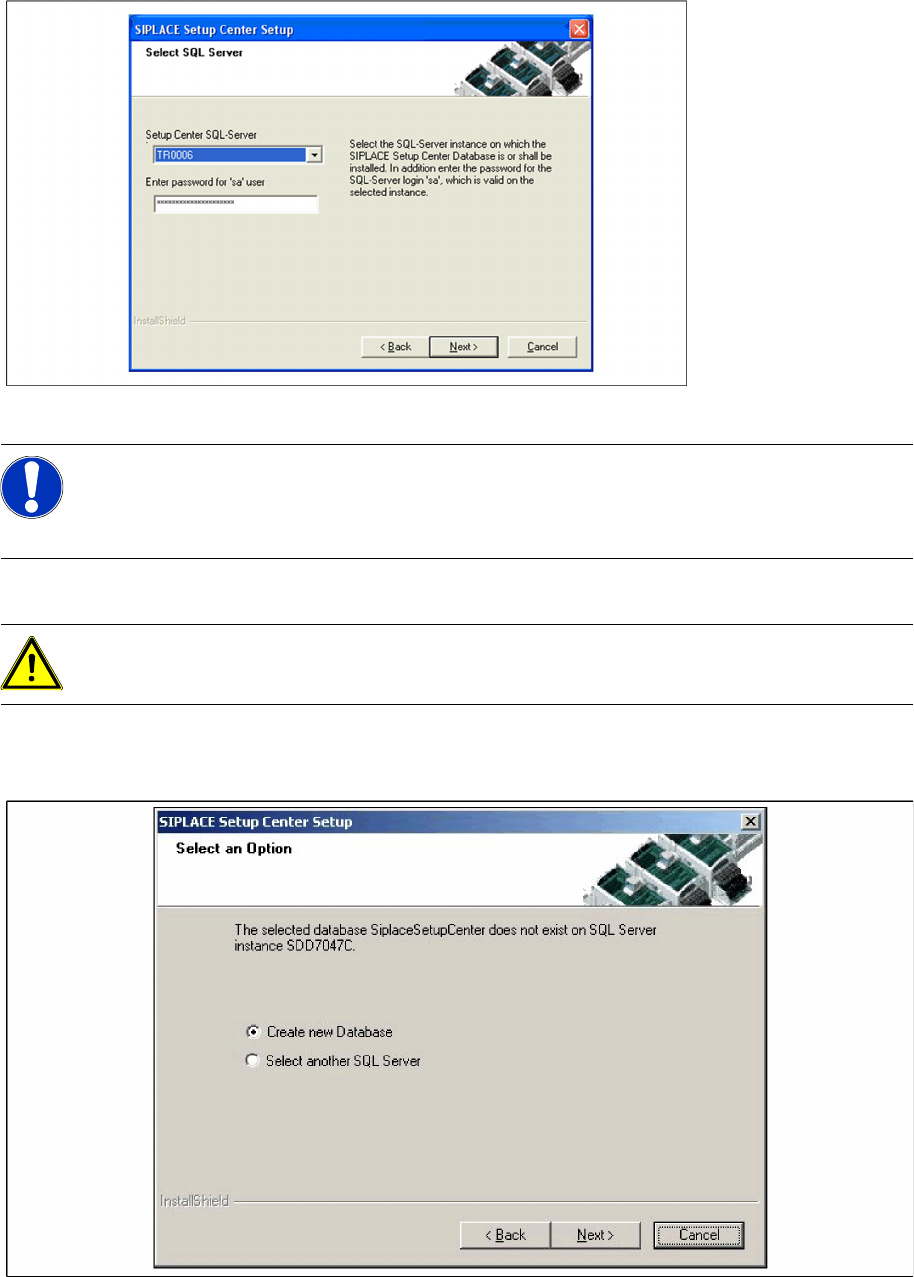 Installation Setup Center Software Installation Installation Manual SIPLACE Setup Center 2.3 51 Step 2 X Enter the in formation required to be connect ed with the SQL Server and d atabase in the Select SQL- Server dialog…