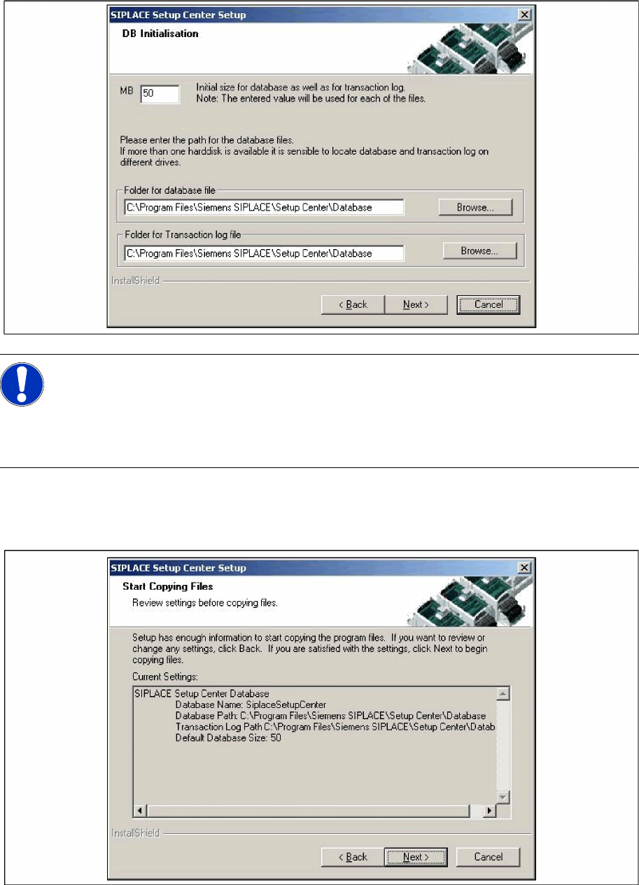 X The figure you enter in the MB text box defines the initial size of the SIPLACE Setup Center database
