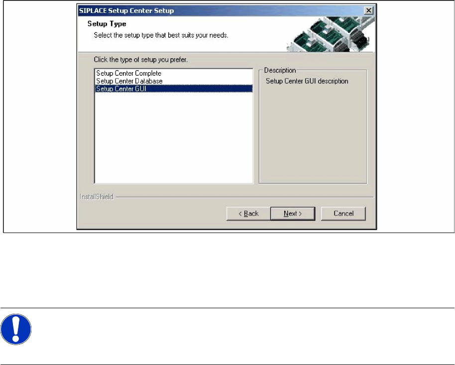 Installation Software Installation Setup Center 48 Installation Manual SIPLACE Setup Center 2.3 X Select the SIPLACE Setup Center GUI setup type. X Click Next . Step 2 The installation de tects the existing SPI version a…