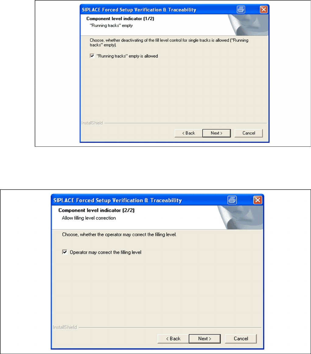 Installation Setup Center Software Installation Installation Manual SIPLACE Setup Center 2.3 59 Setup 4b Fill Level Control (2) X If the filling level correction should be allow ed, activate the checkbox Operator may cor…