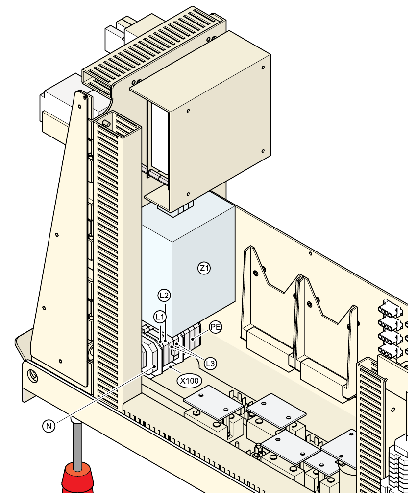 – Morsettiera X100 per il collegamento del cavo d'alimentazione di rete