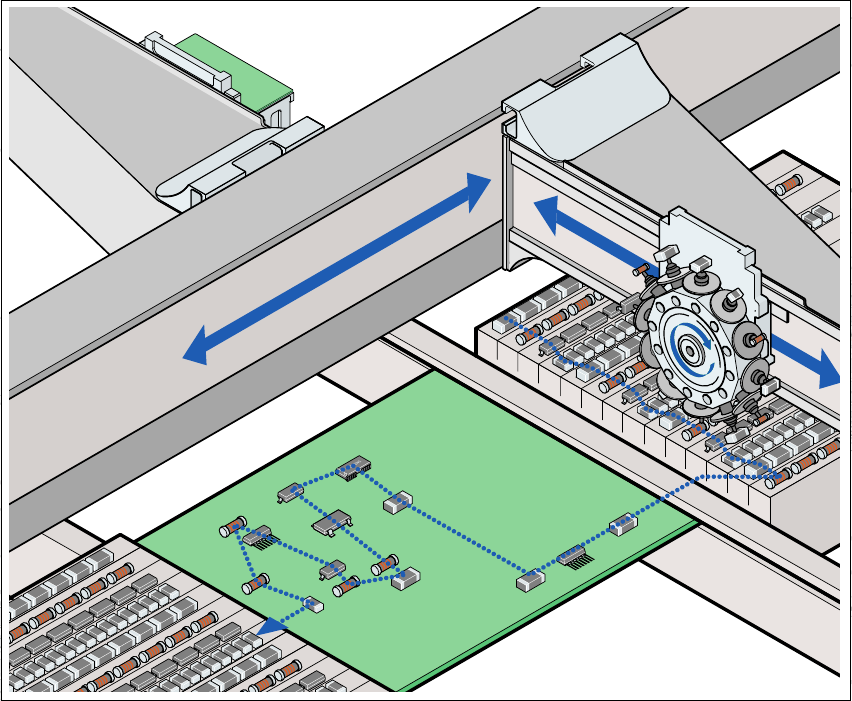 Le teste di montaggio prelevano i componenti dai caricatori posizionati fissi nei carrelli dei com-