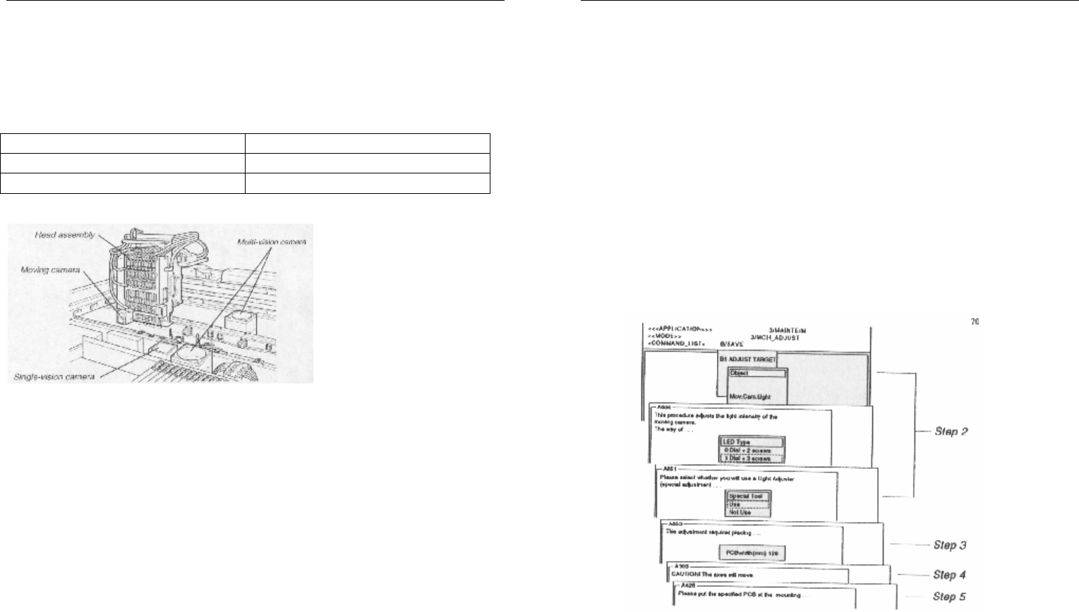 第 三章 调整 3 - 59 3. 光 学 系统 Y V 100 II 标 准 模式机器使用 移动 镜 头 以 识 别 P CB 基准 标 记 ,使用 一个 线 性影像 传感 器( 称为 复合 光 学镜 头 )以 识 别元 件, 另 外 , 当 机器 安 装 了 可选 单光 学镜 头 , 则 可 识 别 更 大 范围 的 元 件 类 型 。 l 光 学 系统 类 型 移动 镜 头 用于 识 别 P CB 标 记 (如 基准 标 记 ) …