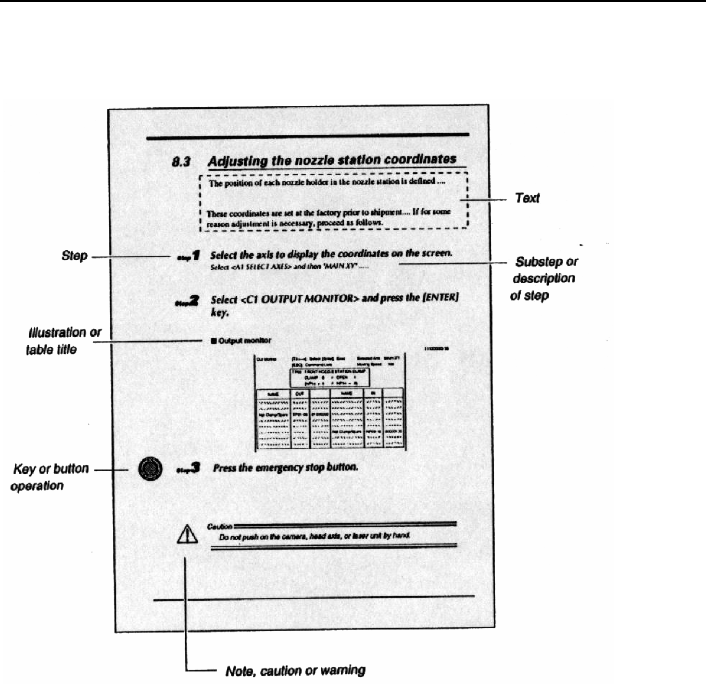 第一章 如何使用本书 3 . 页面的编排 页面的编排如下 z 典型页面编排: 步骤 描述各项操作流程 步骤描述 提供各步骤操作流程的详细信息 图表标题 在左上方显示图表标题 键及按钮操作 此符号表示所需的键或按钮位于主机,键盘或 YPU 上。 注意,小心,警告 在“安全及保修”中已详细说明 1-5