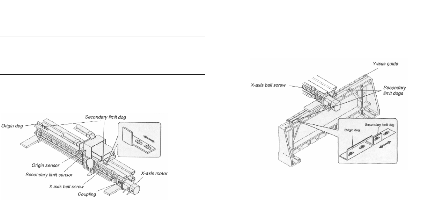 第 三章 调整 3 - 1 15 第 四 步 缓慢 向 回移动 工 作头 以 寻找 第二 限 位。 当获 得 屏幕 底 部的 X 轴 坐 标 之 后 , 检 查第 二 限 位传感 器 激活 位 置( 屏幕 左 下 方 信息 变回 “ E M E R G E N C Y S T OP ” )的 X 坐 标 。 当 此 坐 标 为 第三 步 所 记 的 硬 限 位坐 标 向 内 1. 0 0 mm 。 则 无 需调整。如 果 不 同 ,按以…